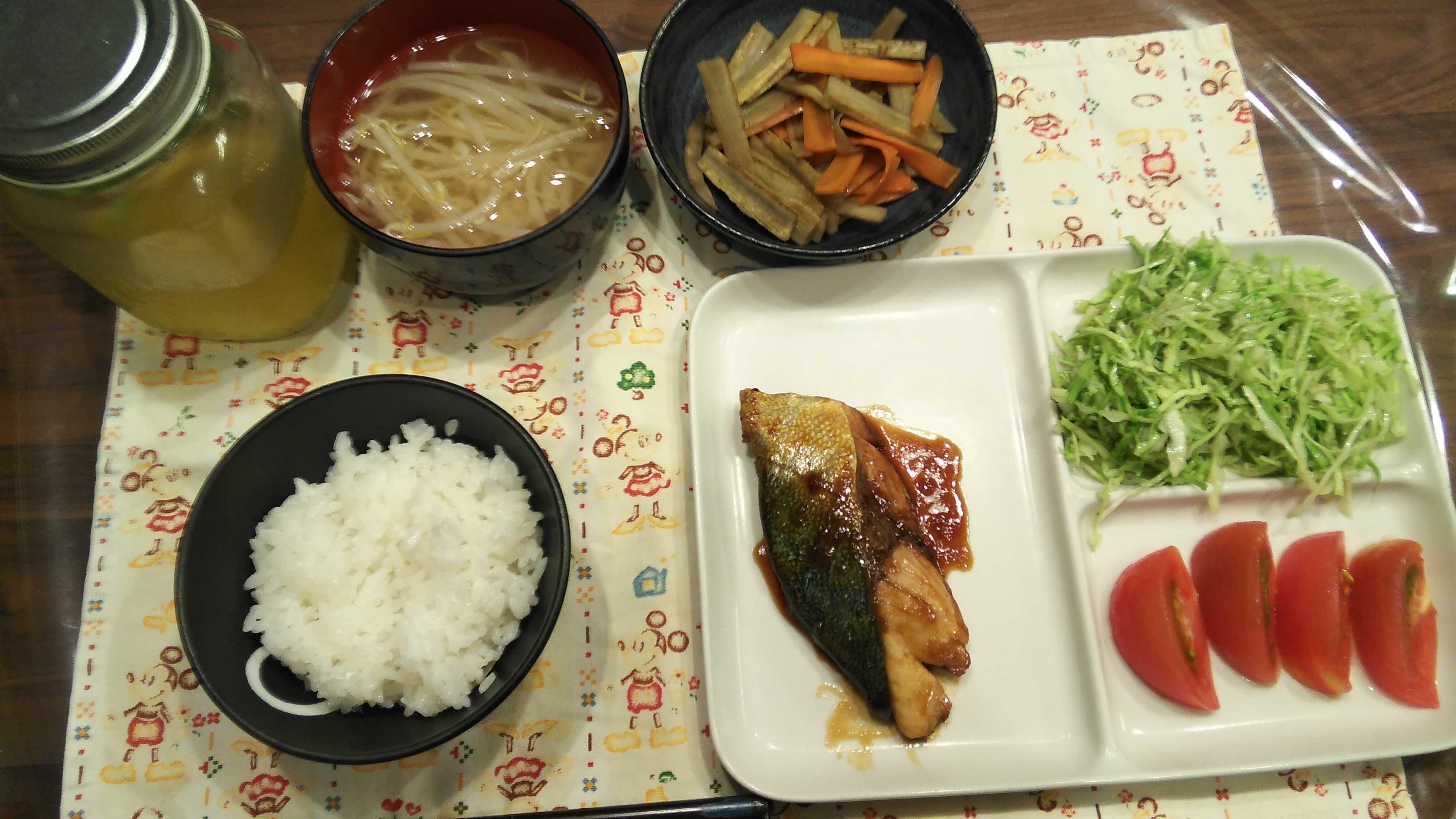 夕食→トマト、サラダ、ぶりの照り焼き、もやしの味噌汁、ご飯、お茶