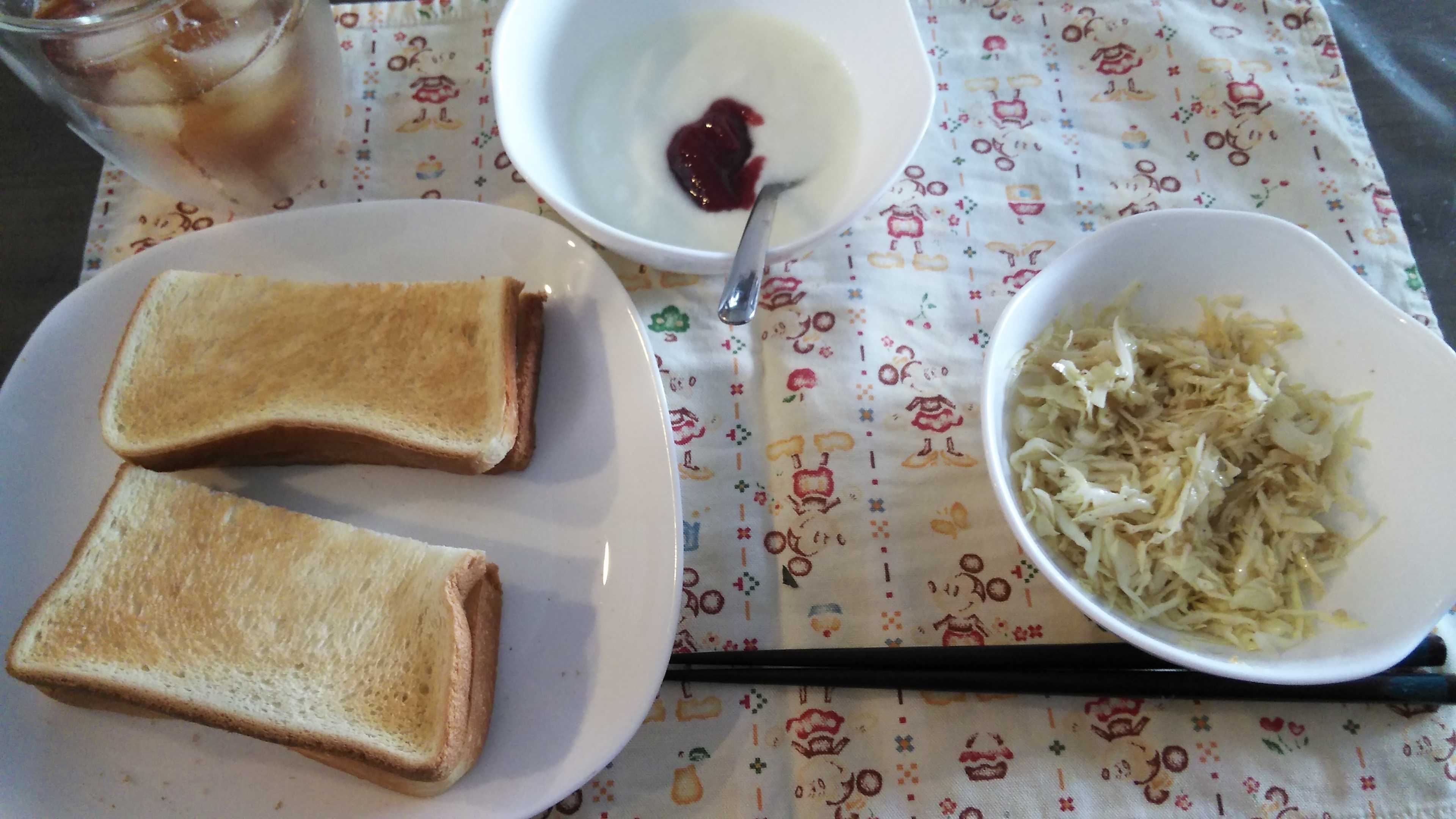 昼食→サラダ、イチゴジャムヨーグルト、ツナチーズサンド、アイスティ