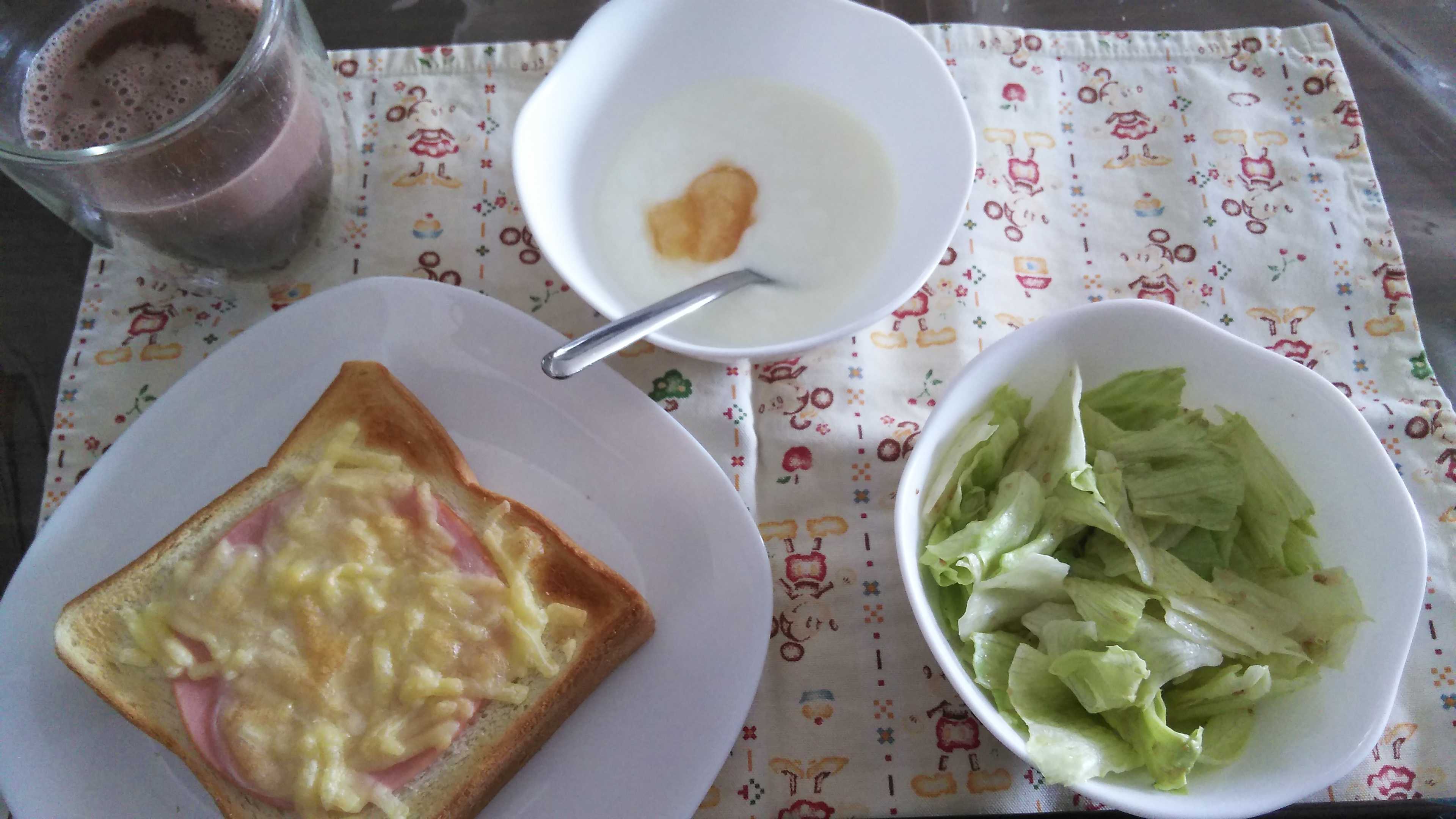 昼食→サラダ、桃ジャムヨーグルト、チーズハムトースト、豆乳ココア