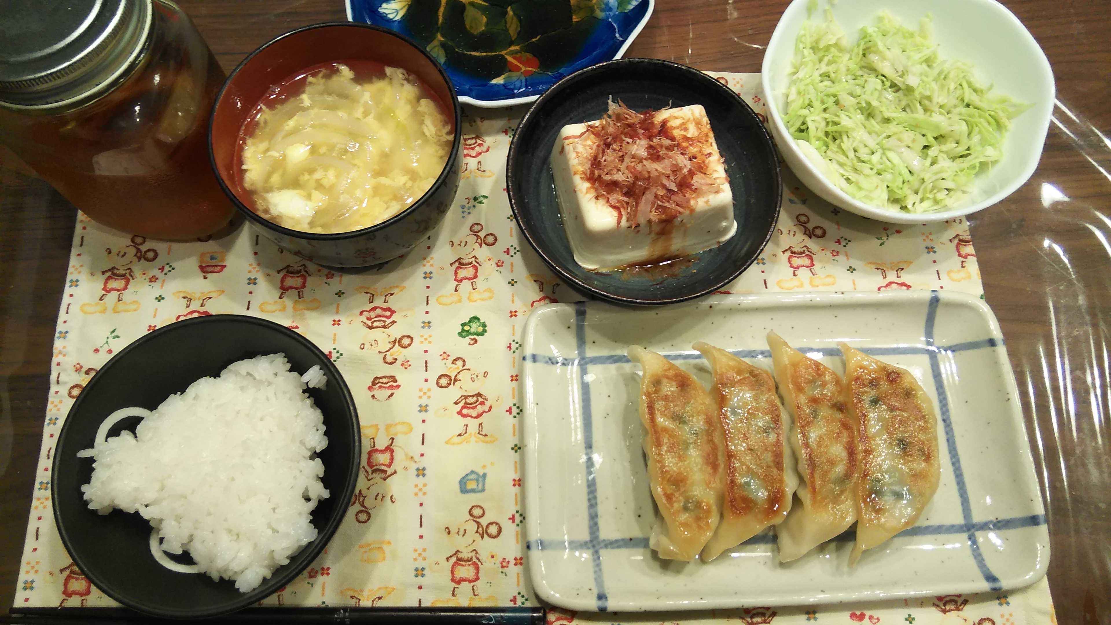 夕食→サラダ、冷奴、餃子、タマネギと卵の味噌汁、ご飯、紅茶