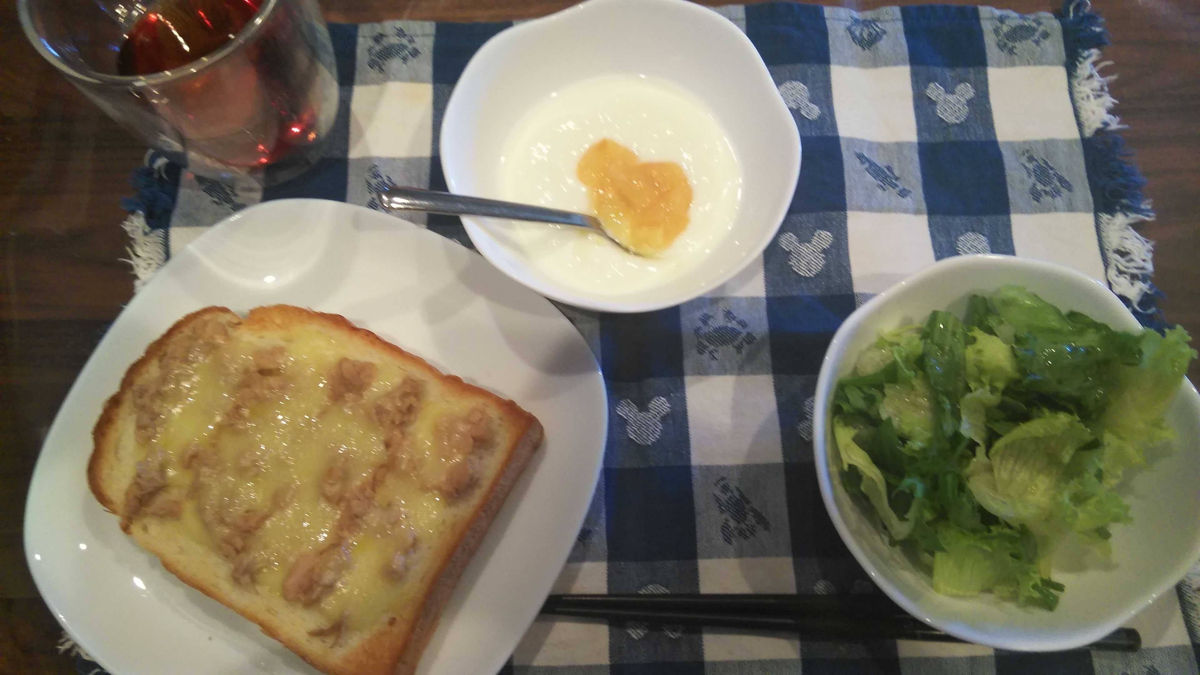 昼食→サラダ、オレンジジャムヨーグルト、ツナチーズトースト、紅茶