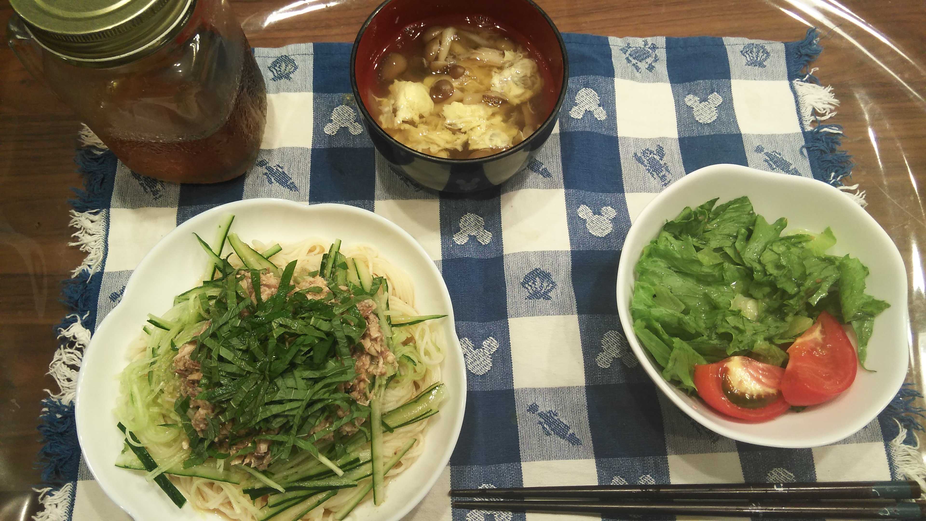 夕食→トマト、サラダ、梅風味サッパリ鯖缶の混ぜソーメン、しめじと卵のすまし汁、紅茶