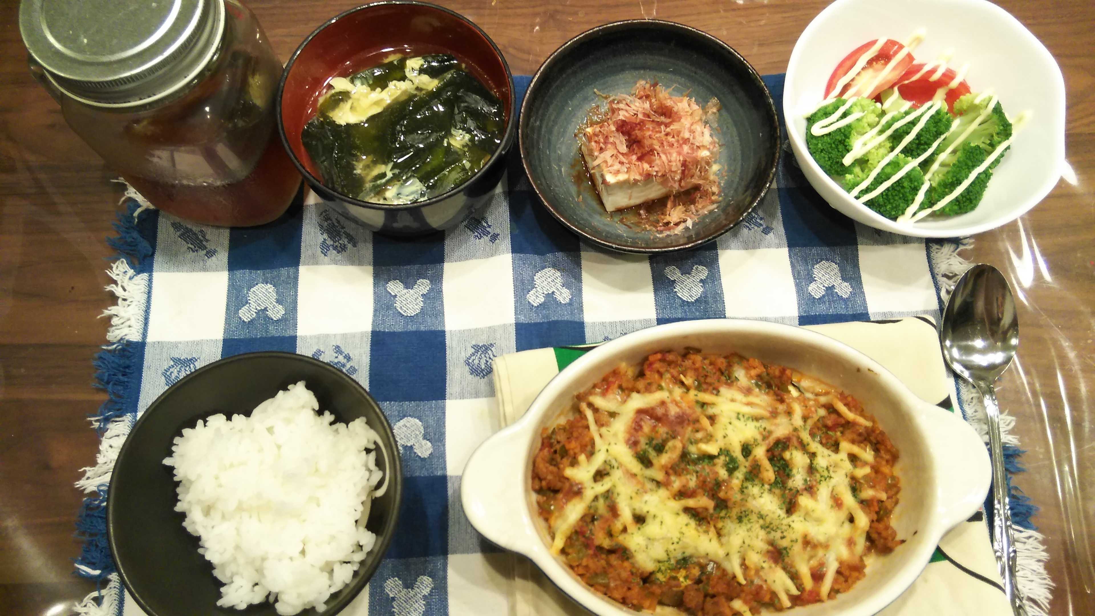 夕食→トマト、ブロッコリーサラダ、冷奴、茄子のグラタン、ご飯、ワカメと卵のコンソメスープ、紅茶