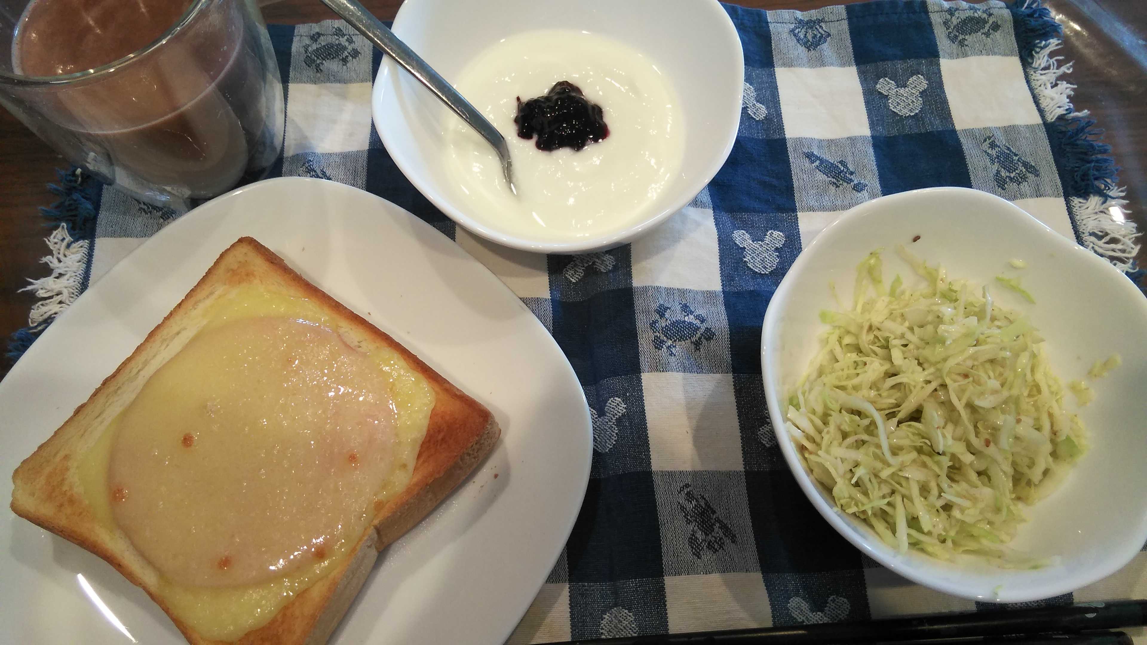昼食→サラダ、ブルーベリージャムヨーグルト、チーズハムトースト、豆乳ココア