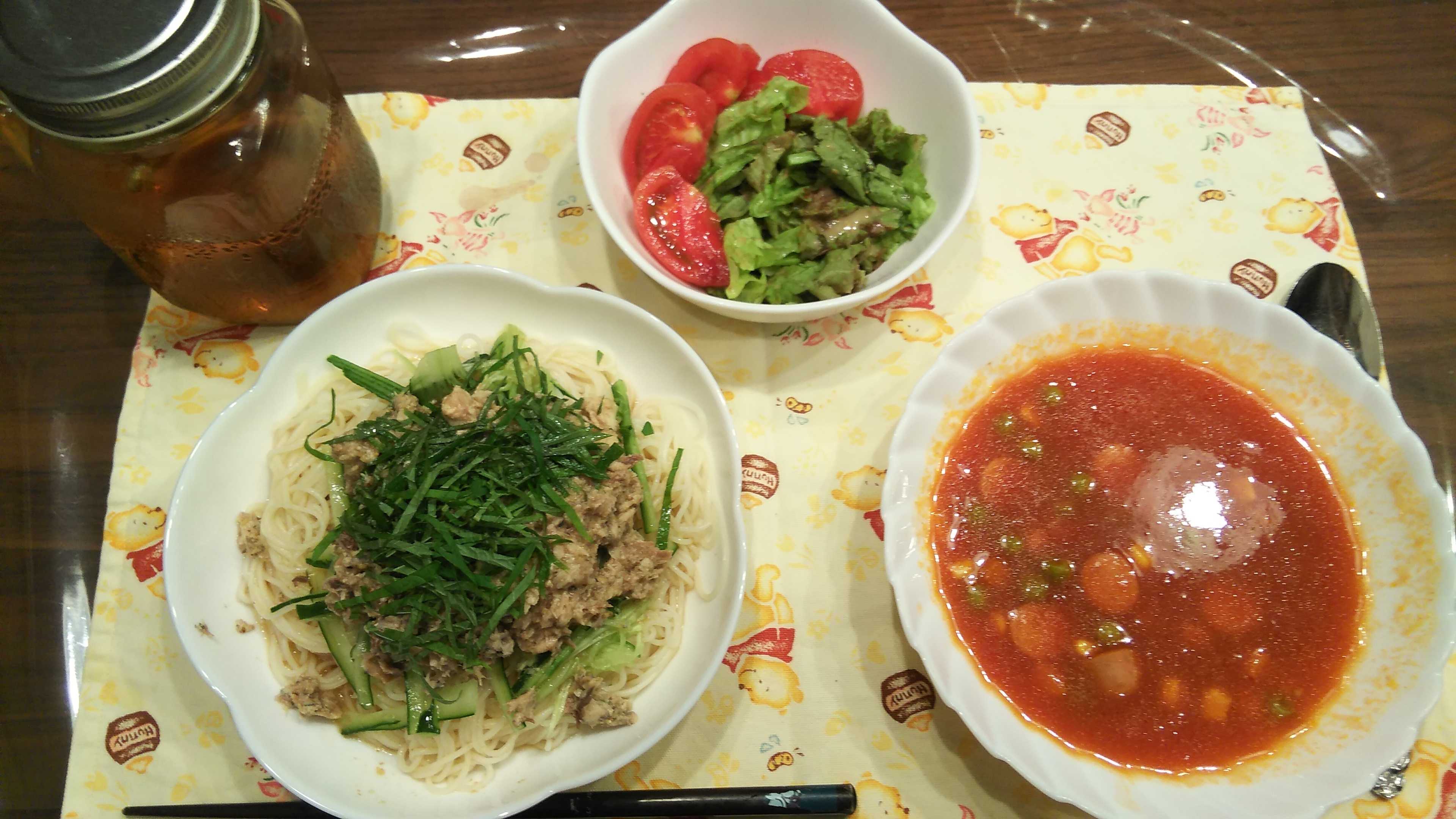 夕食→トマト、サラダ、ミネストローネ風、梅風味たっぷり!鯖缶の混ぜソーメン、紅茶
