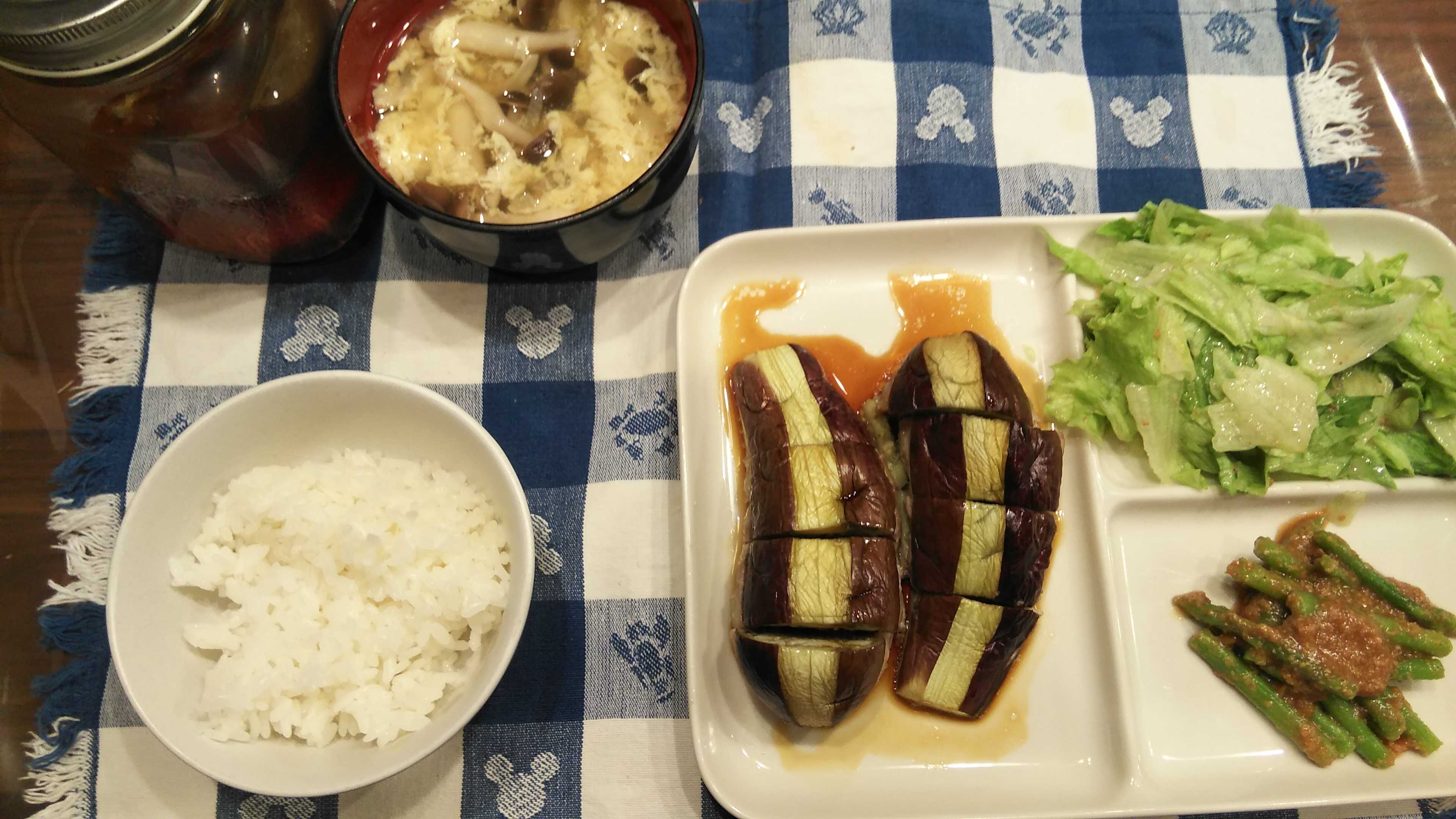 夕食→サラダ、アスパラガスの酢味噌和え、茄子のはさみ焼、しめじと卵のすまし汁、ご飯、紅茶
