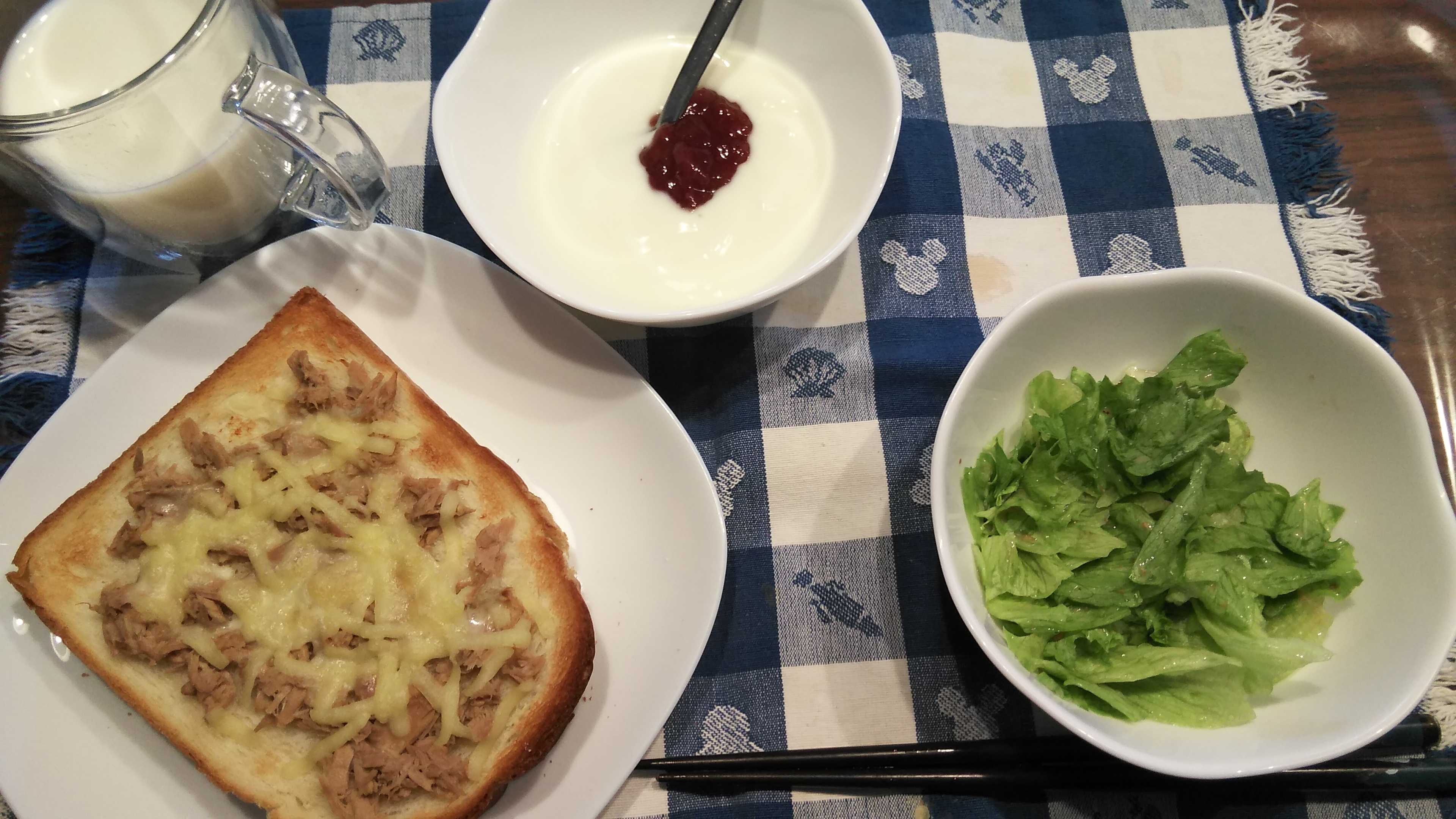 昼食→サラダ、イチゴジャムヨーグルト、ツナチーズトースト、牛乳