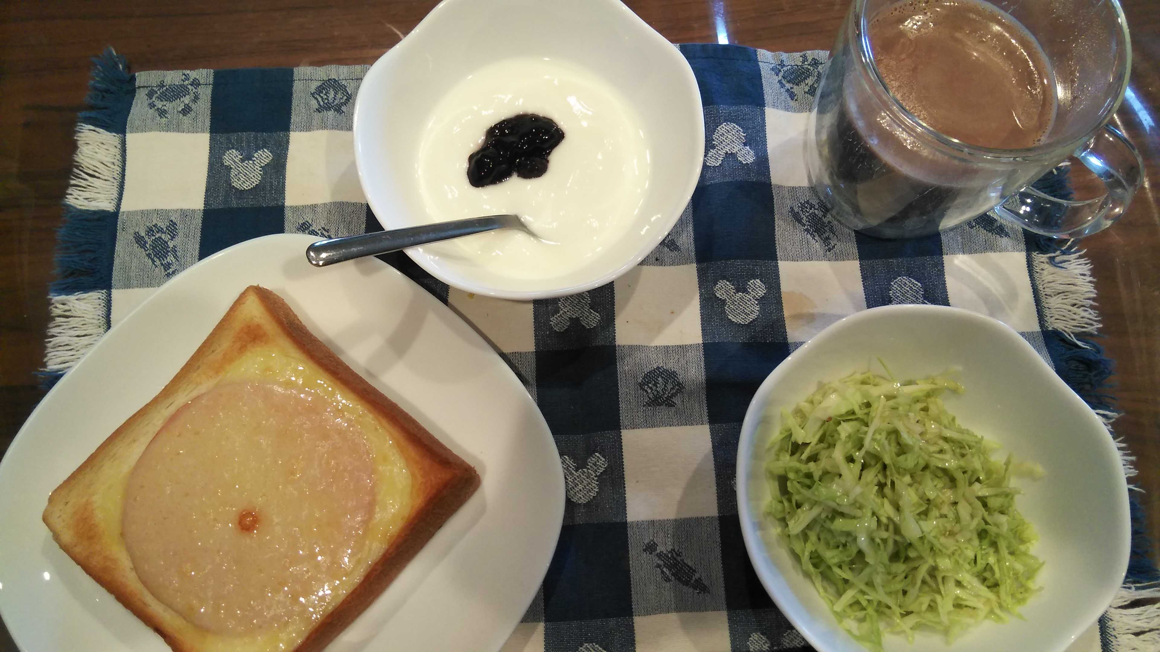 昼食→サラダ、ブルーベリージャムヨーグルト、チーズハムトースト、豆乳ココア
