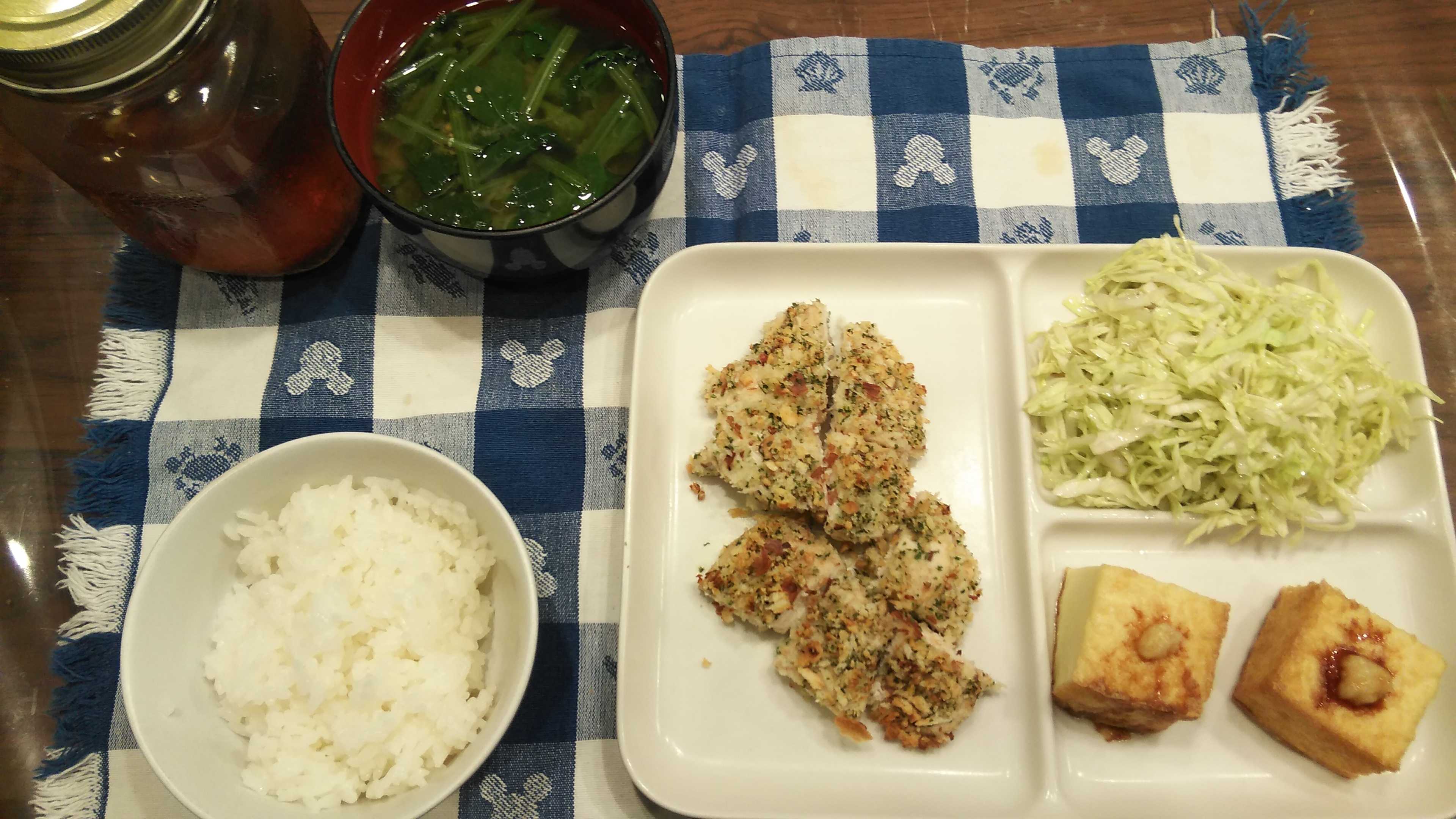 夕食→サラダ、厚揚げ豆腐1/2、鶏肉のアーモンド入りパン粉焼き、ご飯、ほうれん草の味噌汁、紅茶
