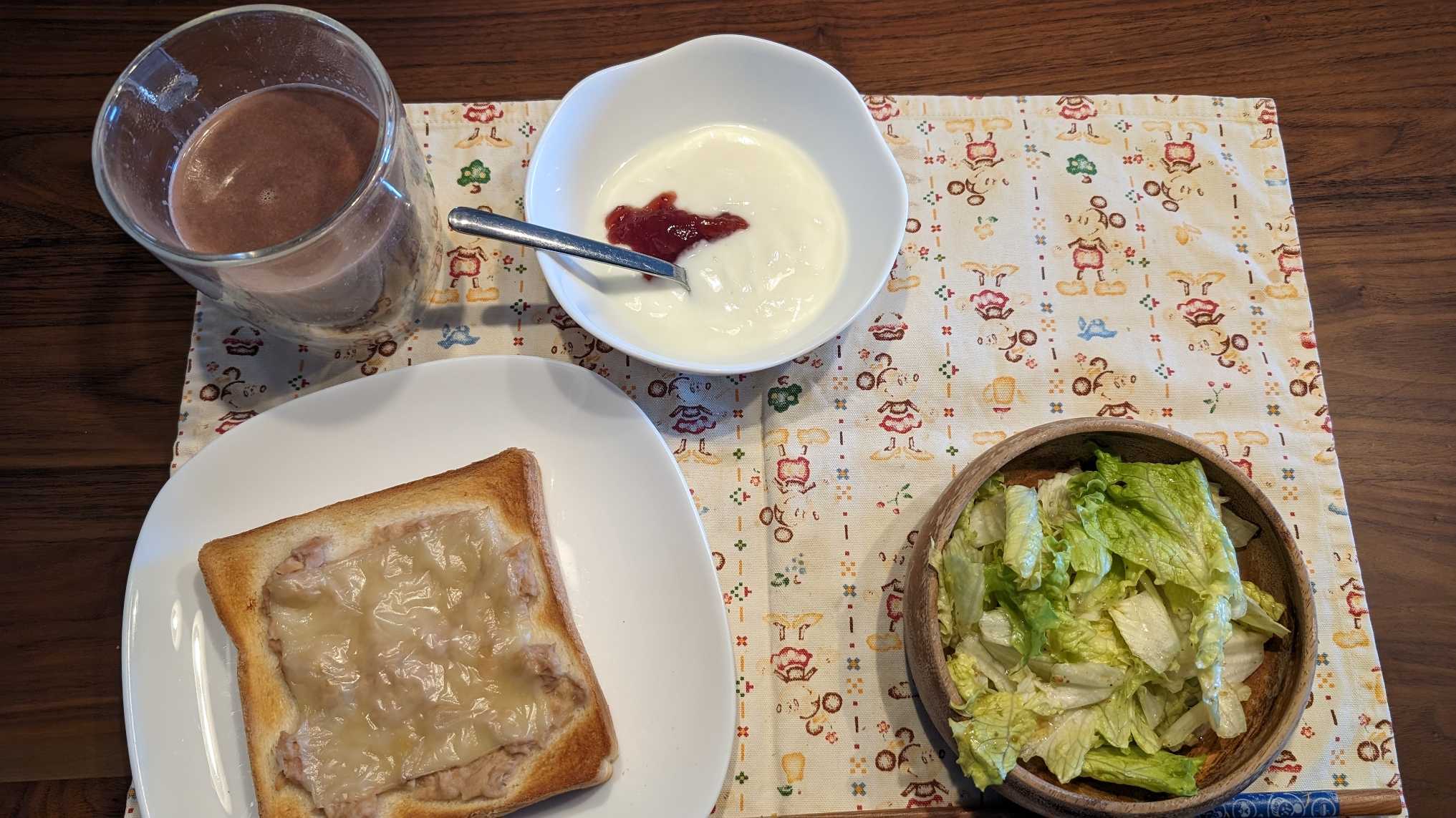 昼食→サラダ、イチゴジャムヨーグルト、ツナチーズトースト、豆乳ココア