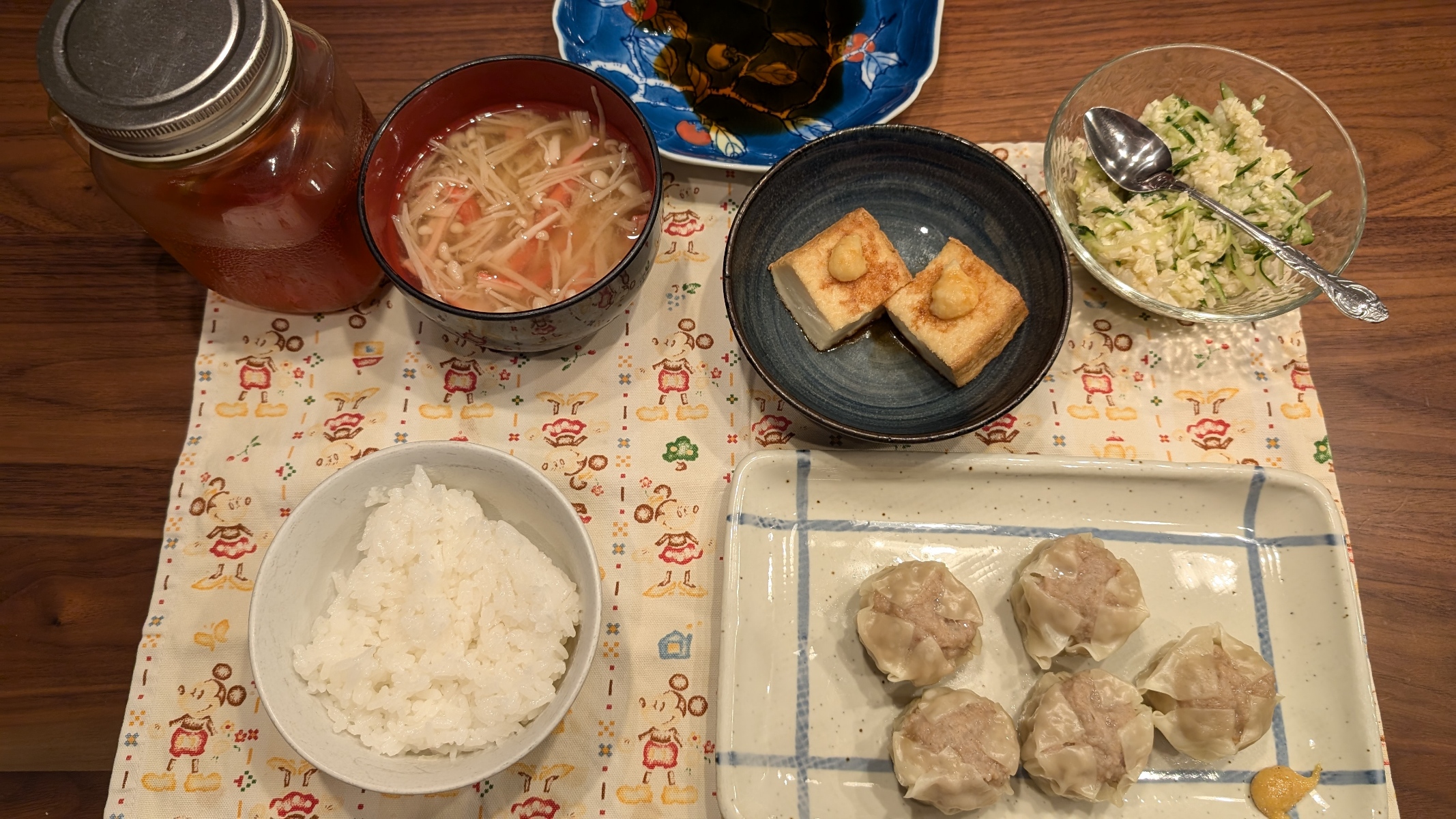 夕食→サラダ、厚揚げ1/2、シュウマイ、ご飯、カニカマとえのきだけの味噌汁、ルイボスティー