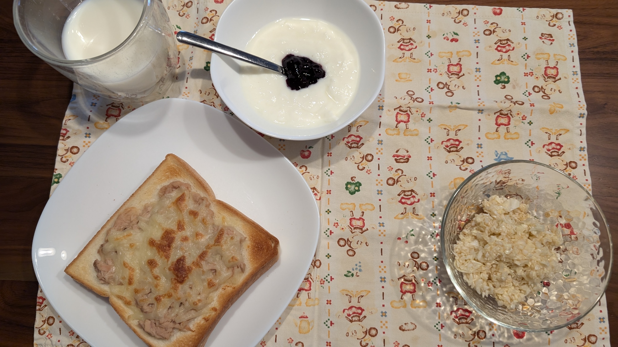 昼食→サラダ、ブルーベリージャムヨーグルト、ツナチーズトースト、牛乳