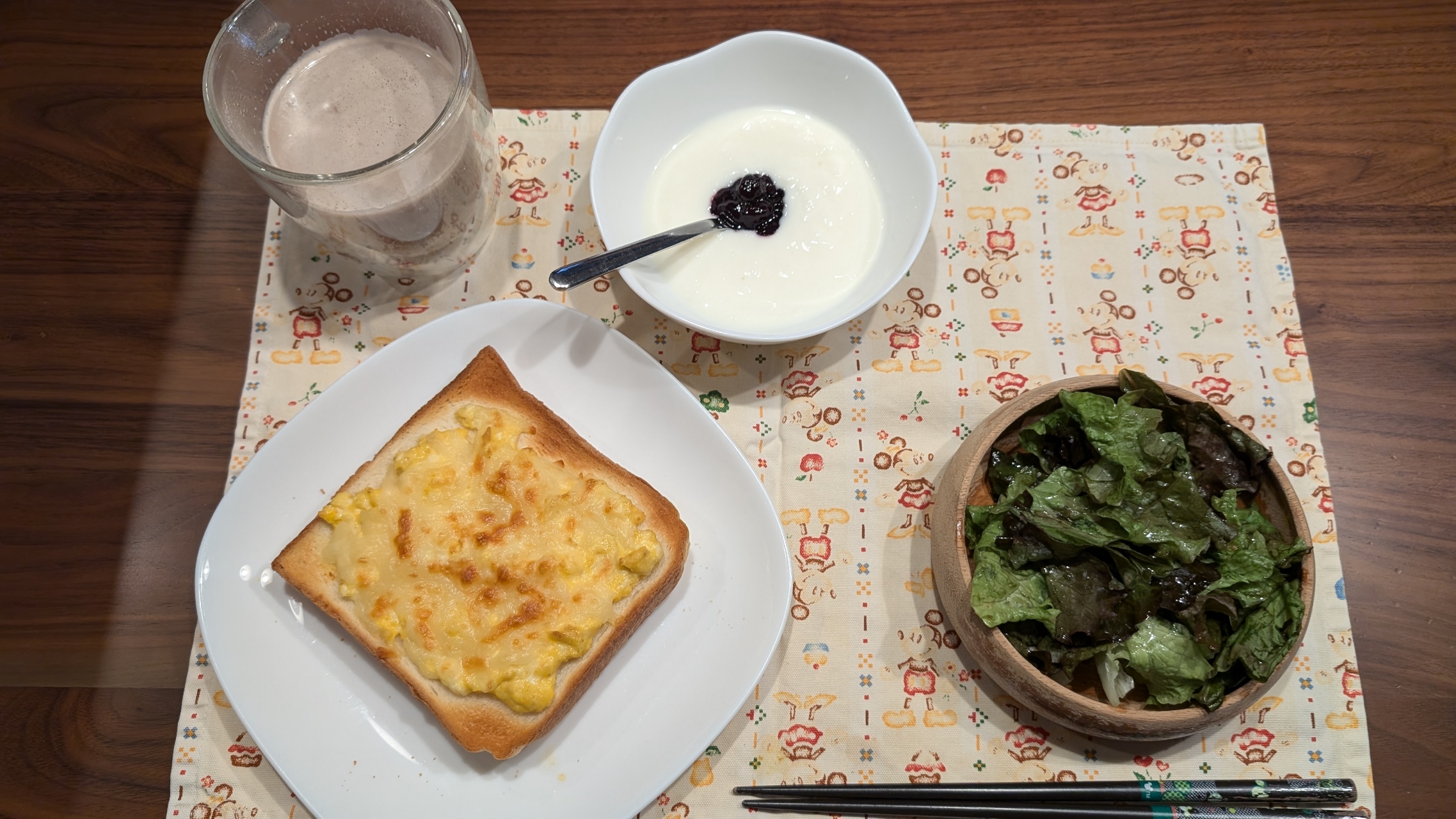 昼食→サラダ、ブルーベリージャムヨーグルト、スクランブルエッグトースト、豆乳ココア