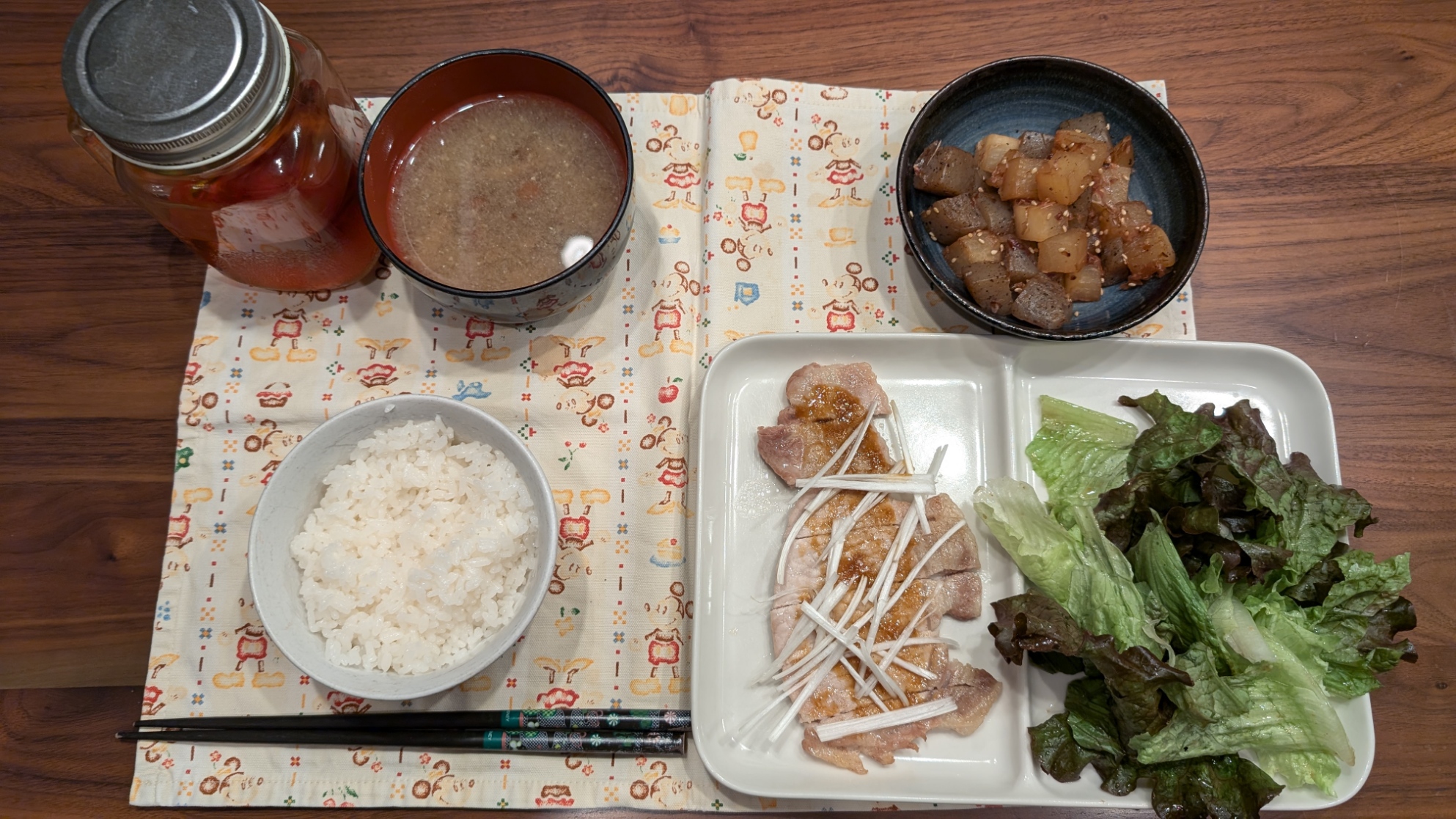 夕食→サラダ、こんにゃくと大根のピリ辛、豚肉のわさび醬油、ご飯、なめこの味噌汁、ルイボスティー