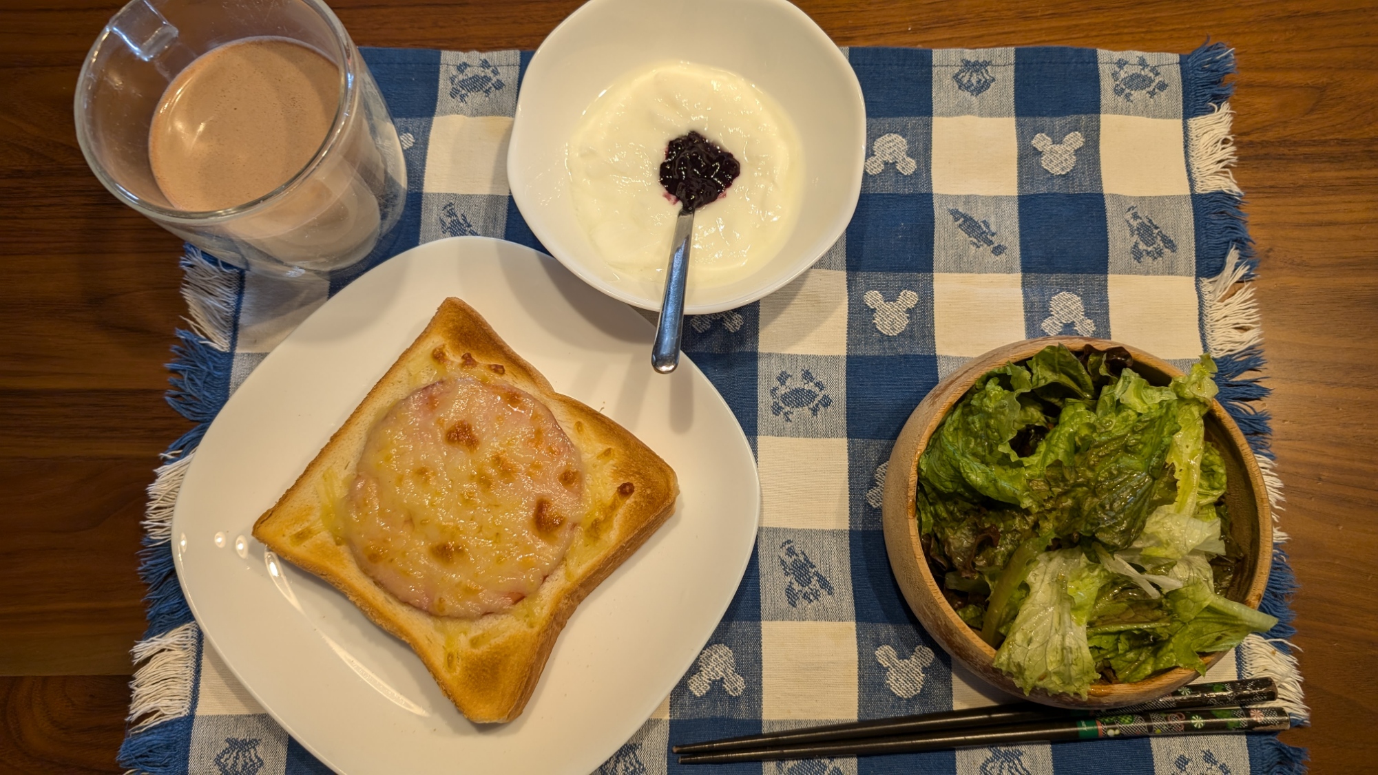 昼食→サラダ、ブルーベリージャムヨーグルト、チーズハムトースト、豆乳ココア