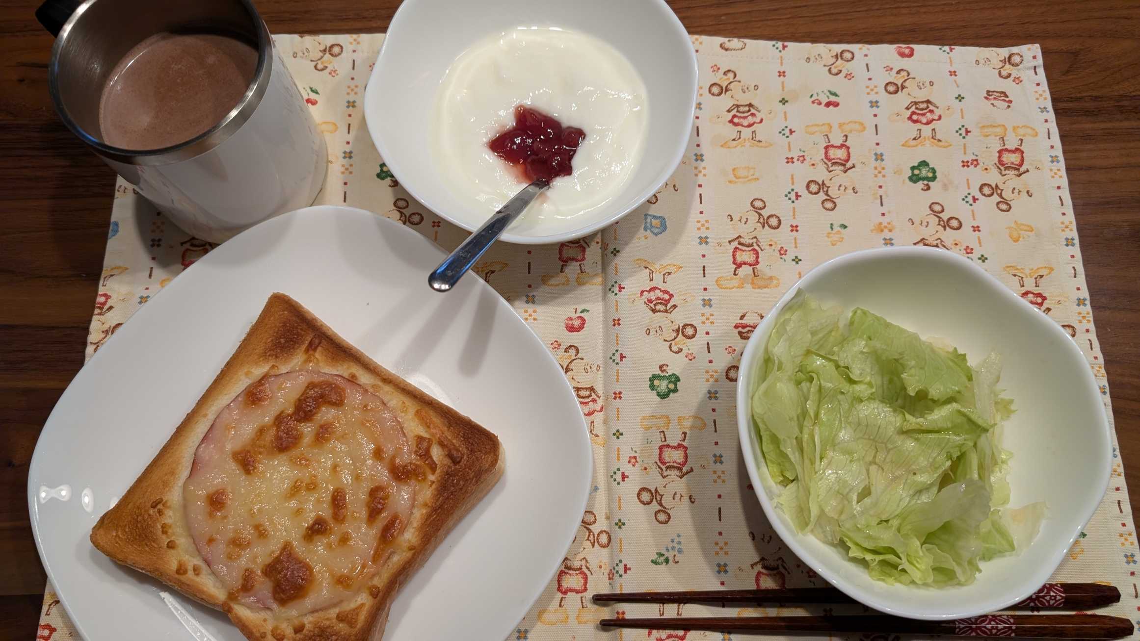 昼食→サラダ、イチゴジャムヨーグルト、チーズハムトースト、豆乳ココア