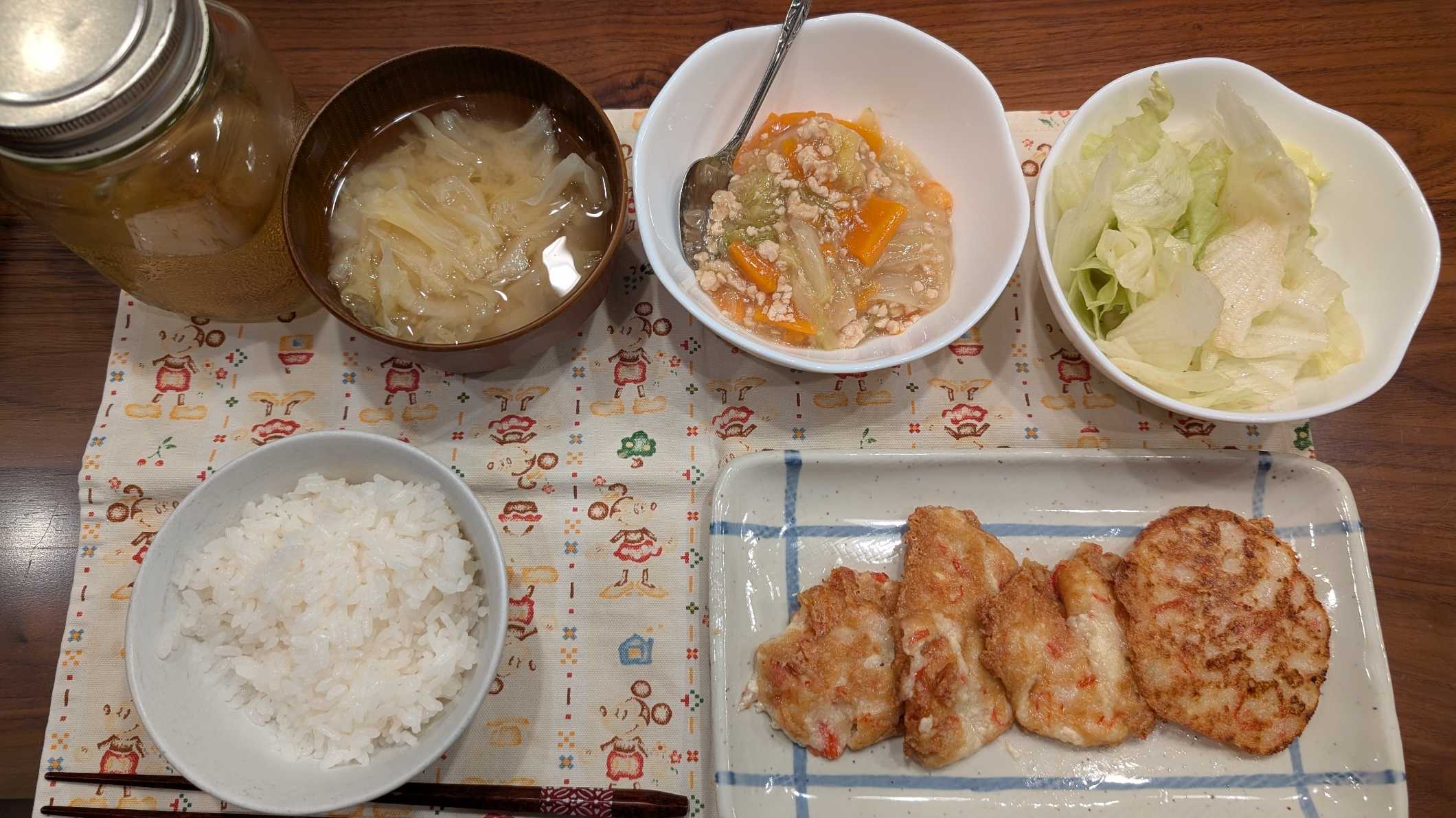 夕食→サラダ、白菜のひき肉煮、豆腐とカニカマのふわふわもち焼き、ご飯、キャベツの味噌汁、ハト麦茶