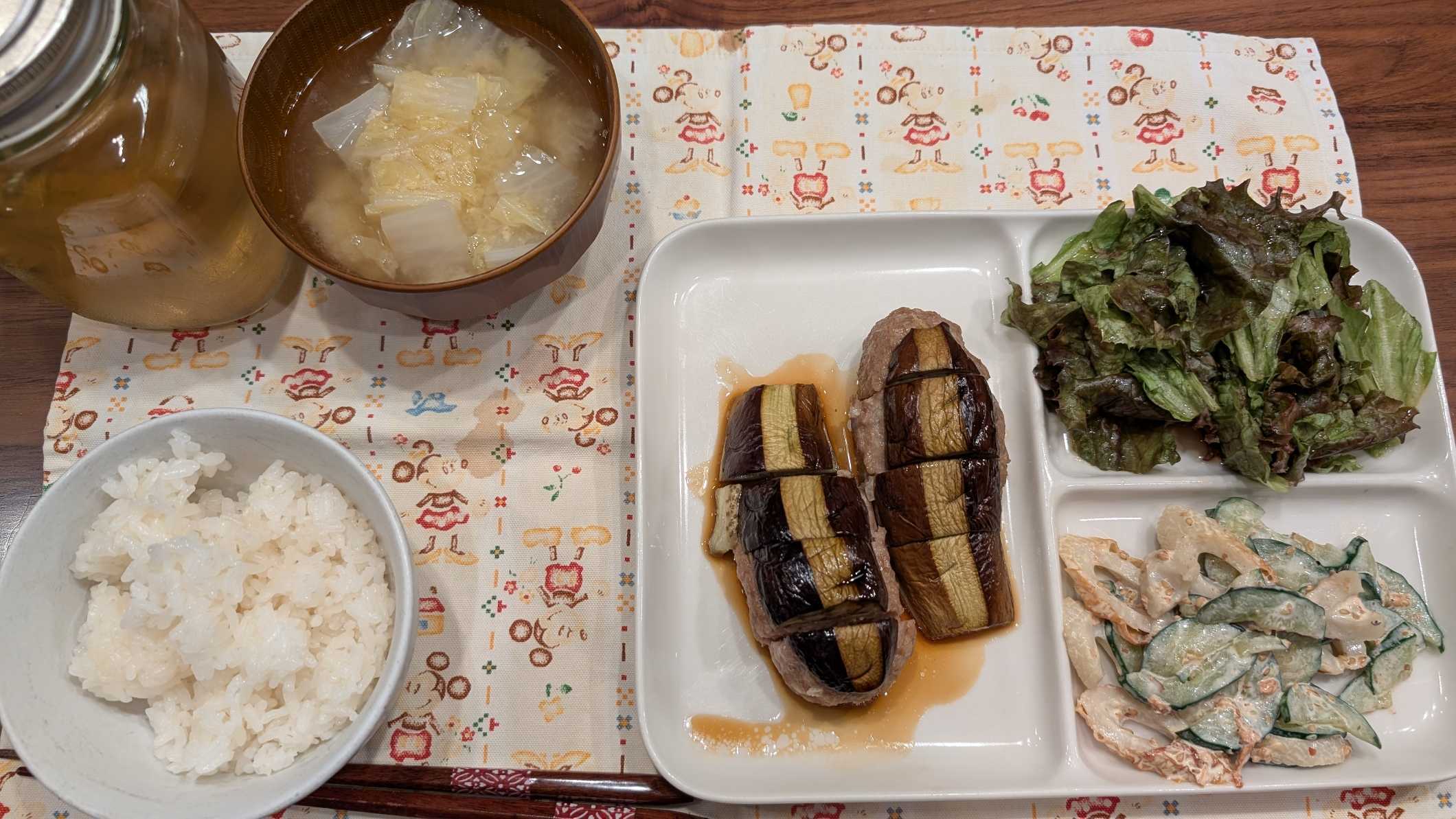 夕食→サラダ、竹輪ときゅうりのおかかマヨ和え、茄子のはさみ焼、ご飯、白菜の味噌汁、ハト麦茶