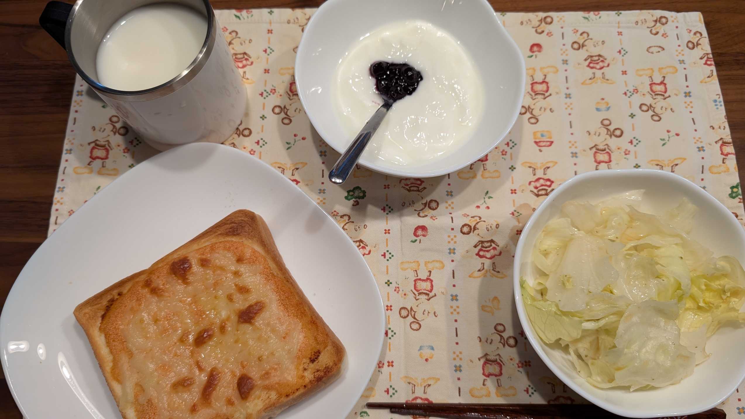 昼食→サラダ、ブルーベリージャムヨーグルト、チーズ明太子トースト、牛乳