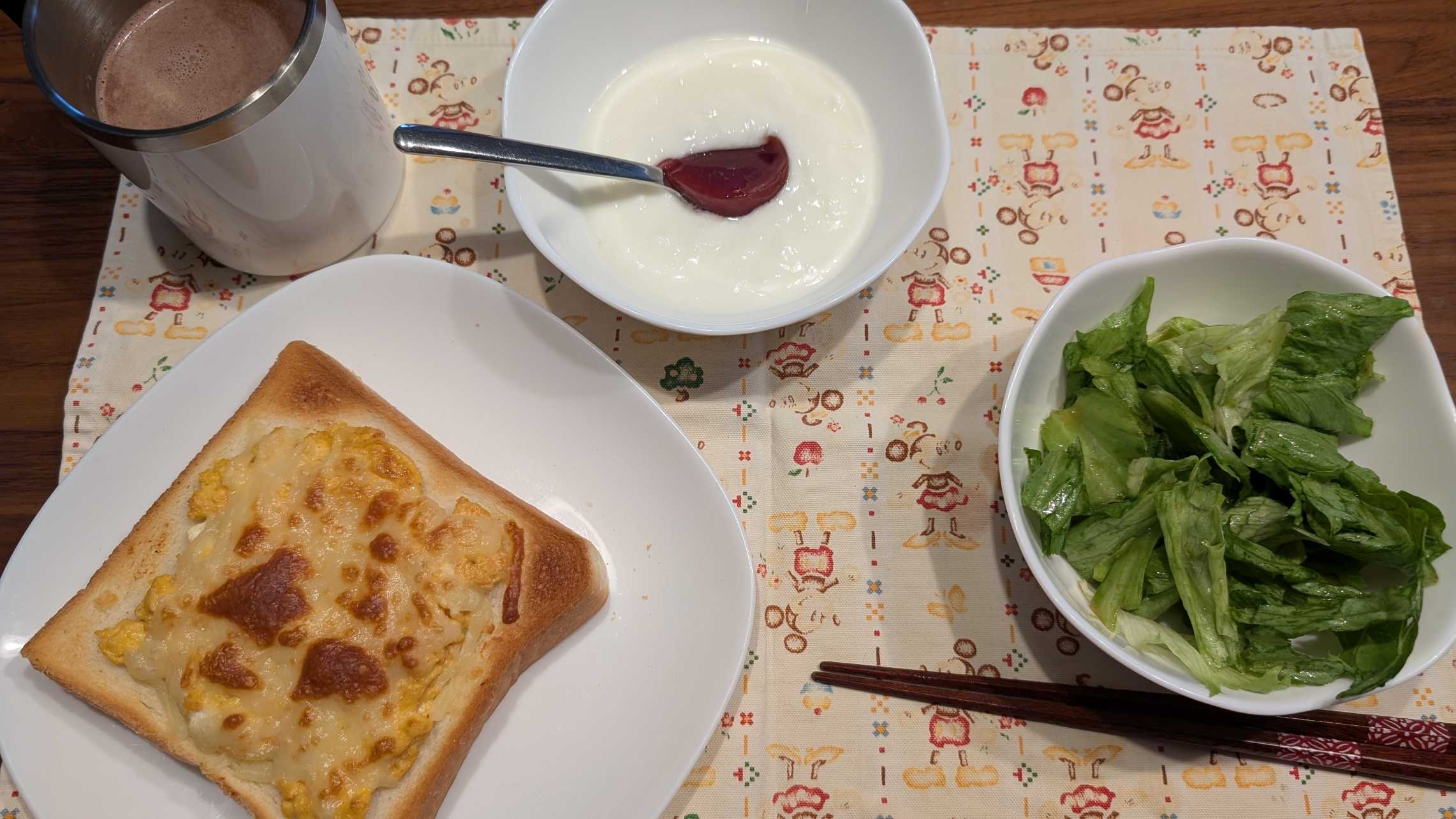昼食→サラダ、イチゴジャムヨーグルト、スクランブルエッグトースト、豆乳ココア