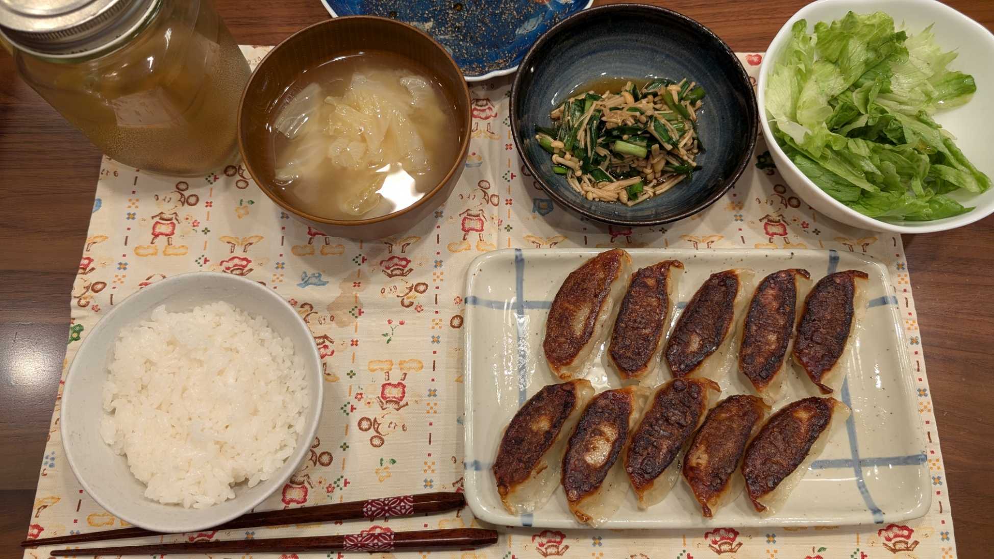 夕食→サラダ、えのきとニラのなめたけ、餃子、ご飯、白菜の味噌汁、ハト麦茶