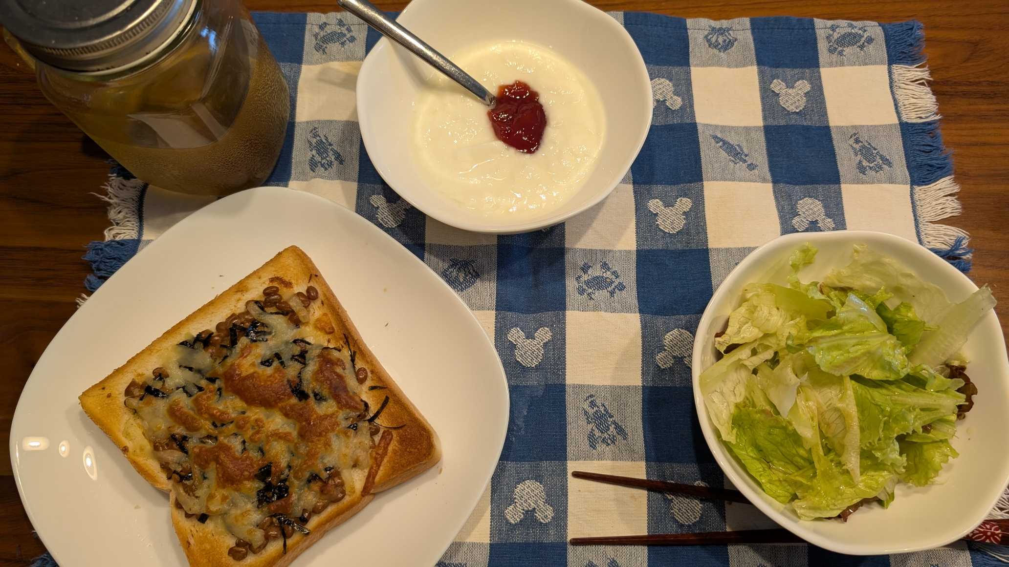 昼食→サラダ、イチゴジャムヨーグルト、納豆トースト、ハト麦茶