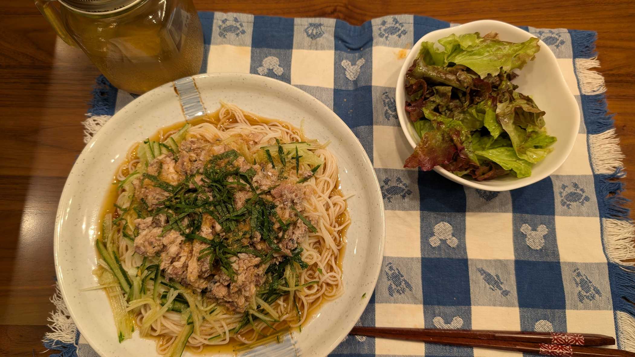 夕食→サラダ、鯖缶そうめん、ハト麦茶