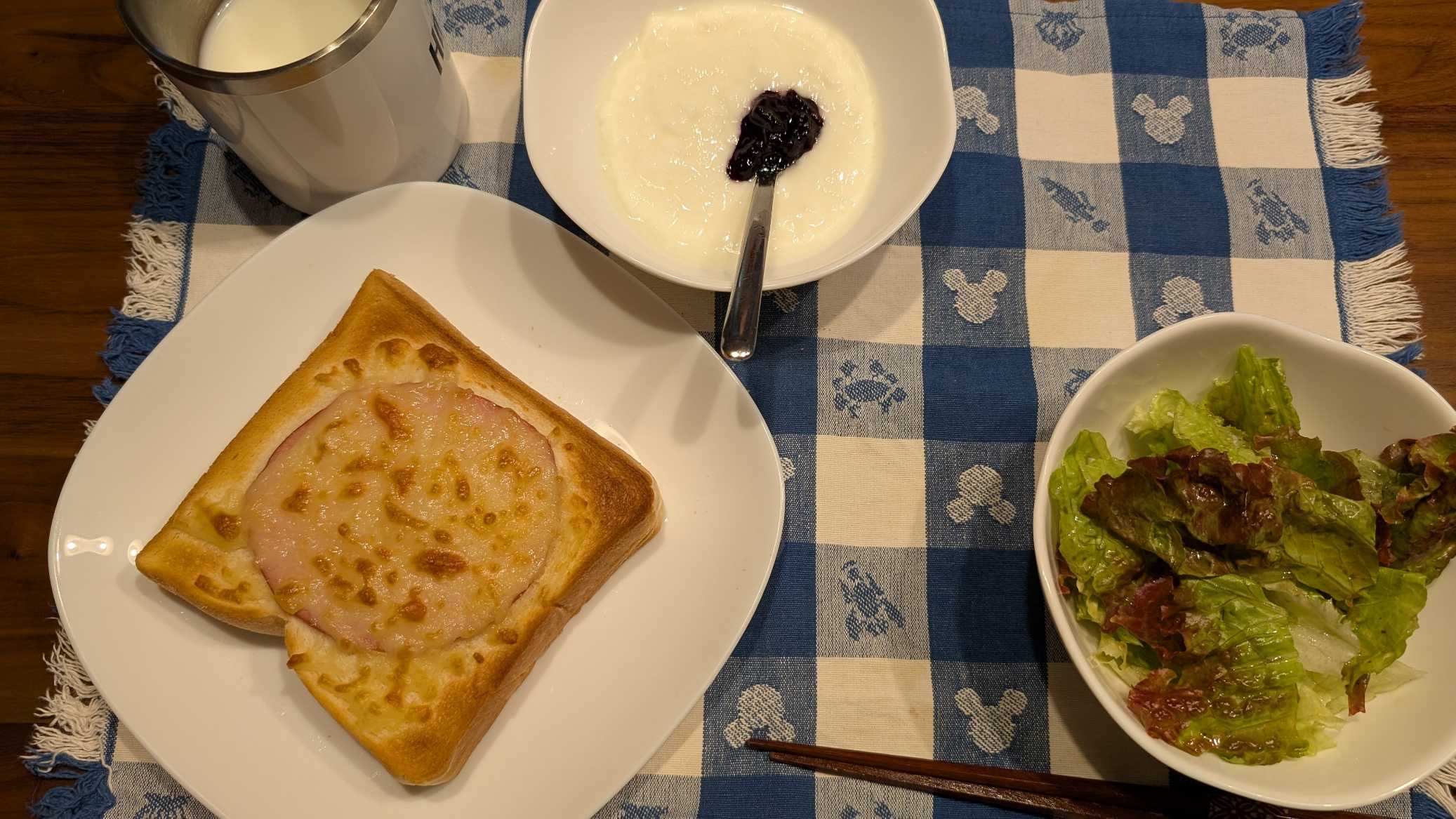 昼食→サラダ、ブルーベリージャムヨーグルト、チーズハムトースト、牛乳