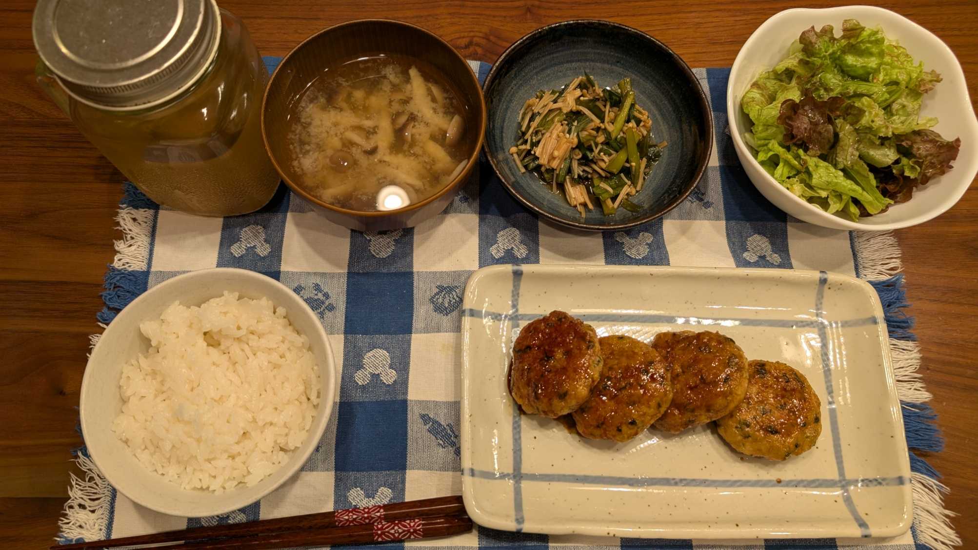 夕食→サラダ、ニラとエノキのなめたけ、えのきと大葉のやみつきつくね、ご飯、しめじの味噌汁、ハト麦茶
