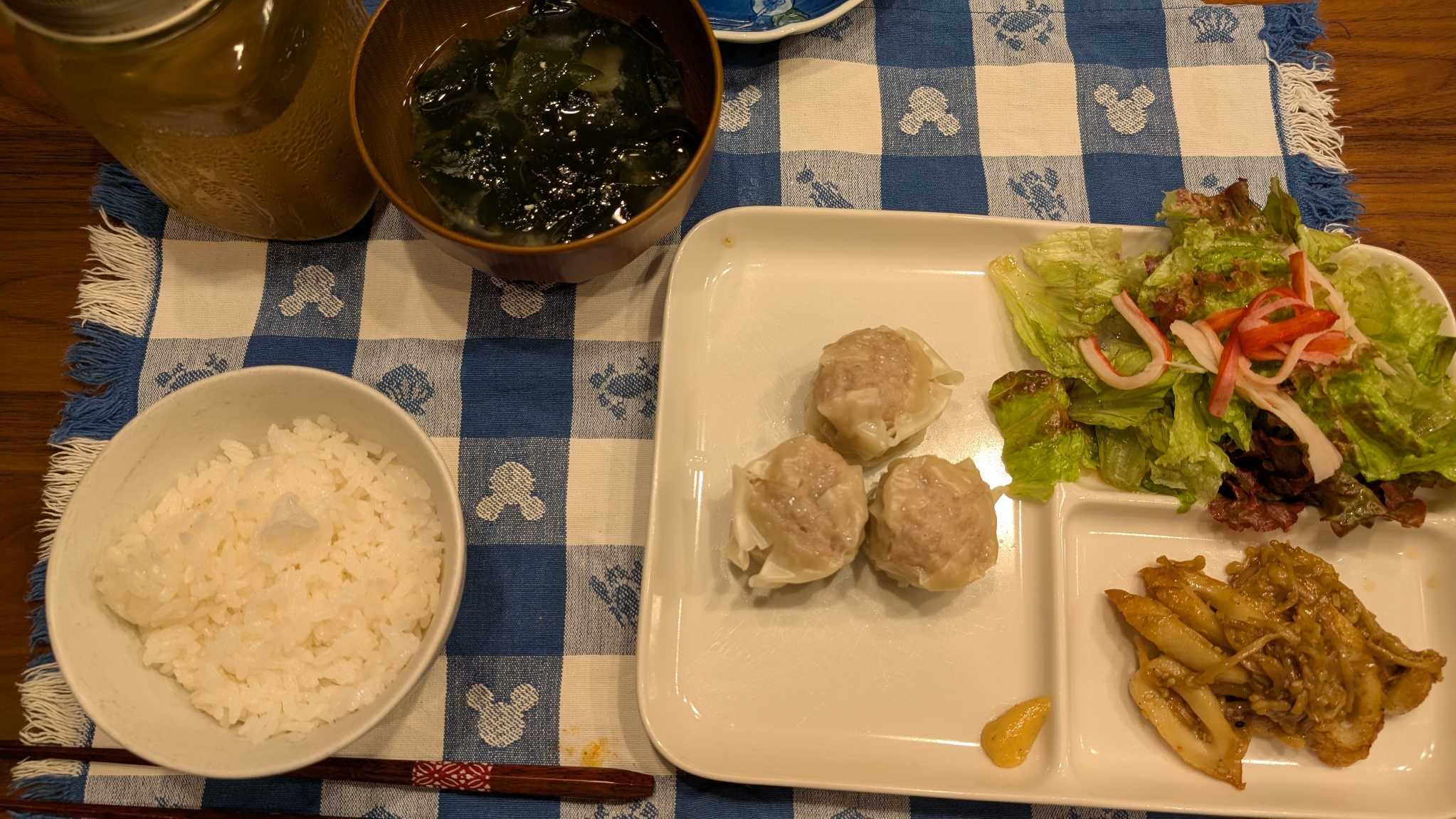 夕食→カニカマサラダ、竹輪とエノキの甘辛味噌炒め、シュウマイ、ご飯、わかめの味噌汁、ハト麦茶