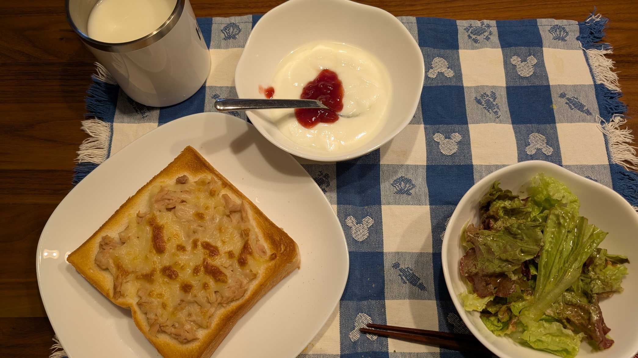 昼食→サラダ、イチゴジャムヨーグルト、ツナチーズトースト、牛乳