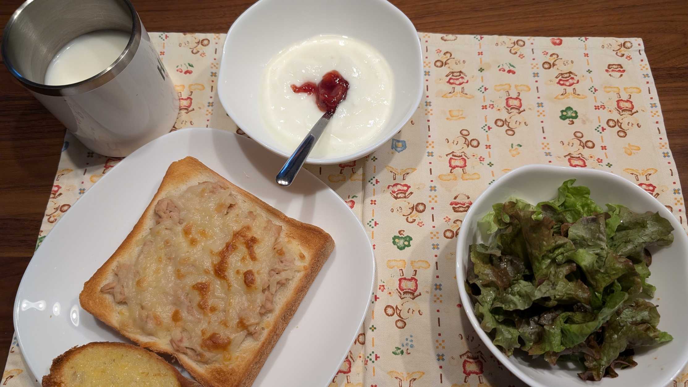 昼食→サラダ、イチゴジャムヨーグルト、ツナチーズトースト、マーガリンバゲット、牛乳