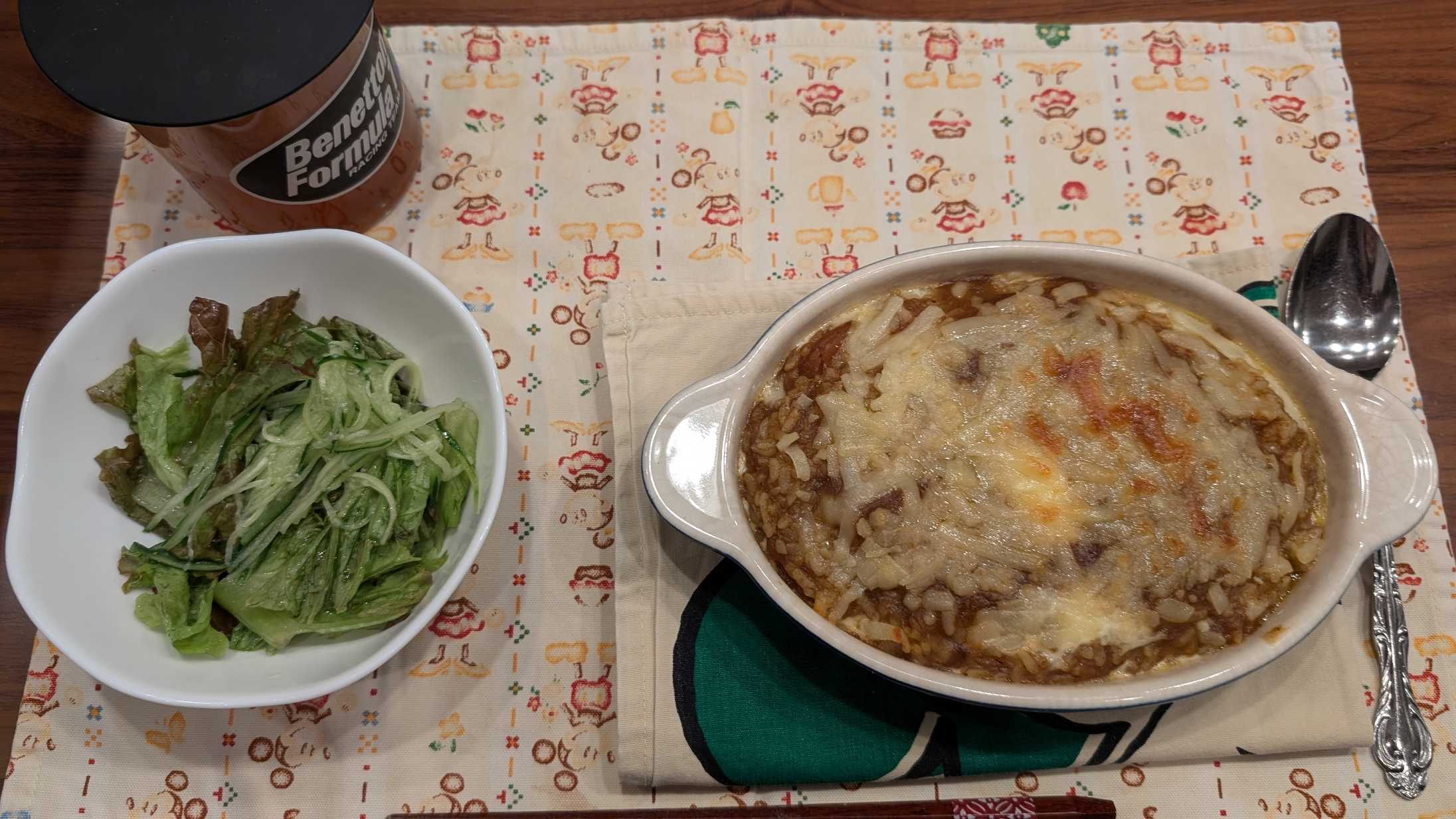 夕食→サラダ、シュリンプカレードリア、ルイボスティー