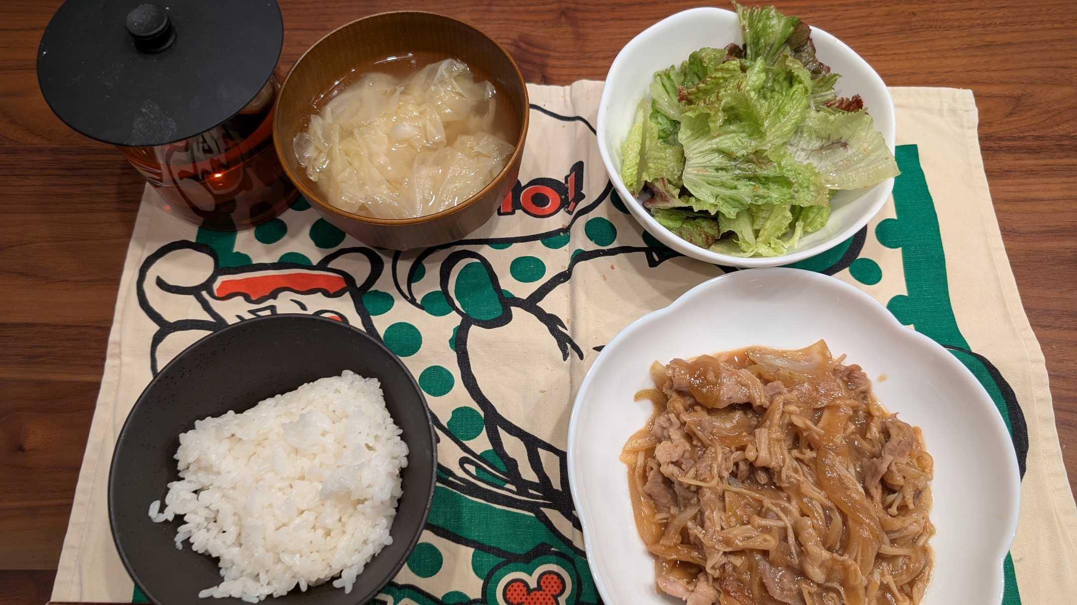 夕食→サラダ、厚揚げ1/2、生姜焼き、ご飯、キャベツの味噌汁、ルイボスティー