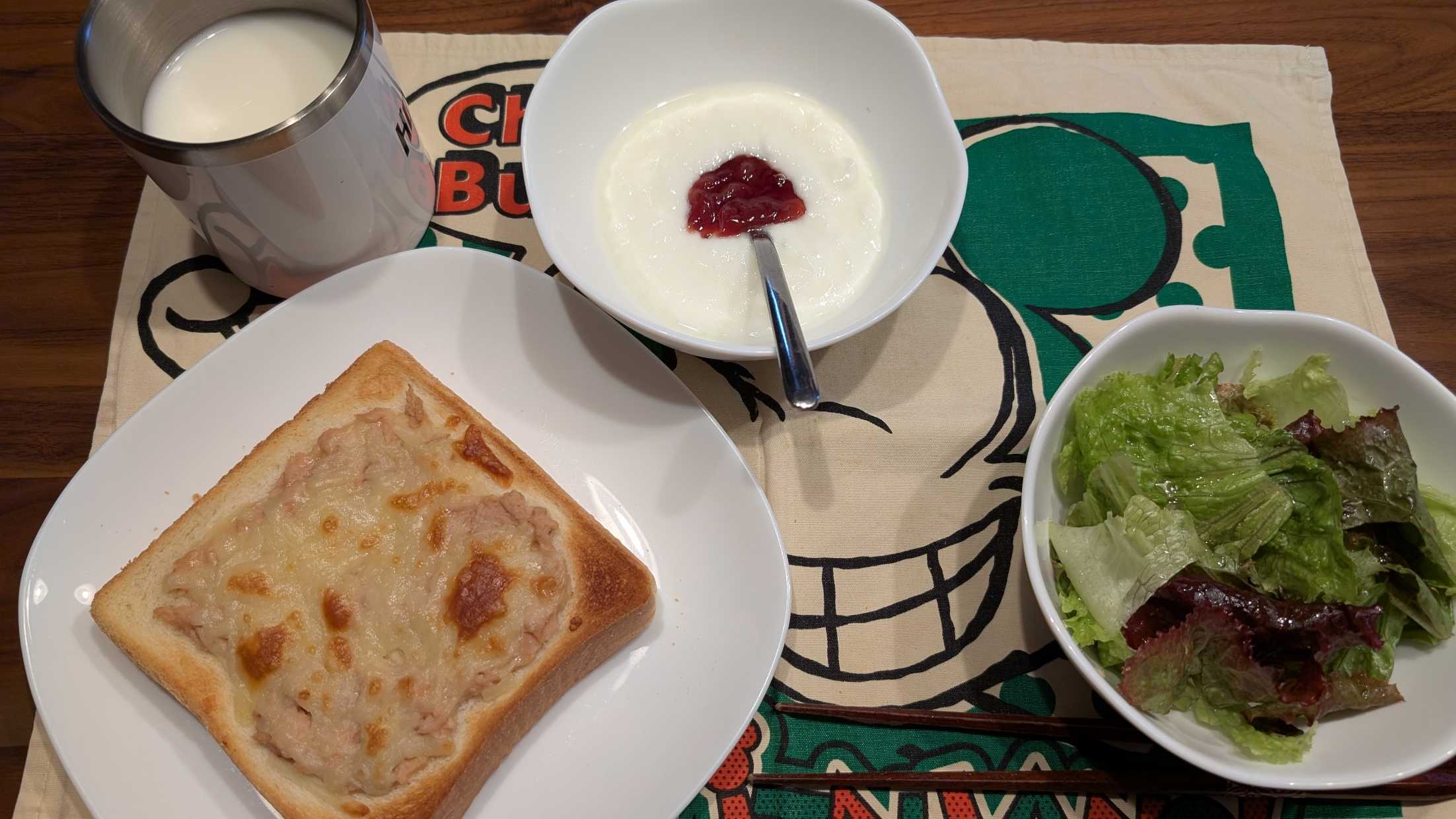 昼食→サラダ、イチゴジャムヨーグルト、ツナチーズトースト、牛乳