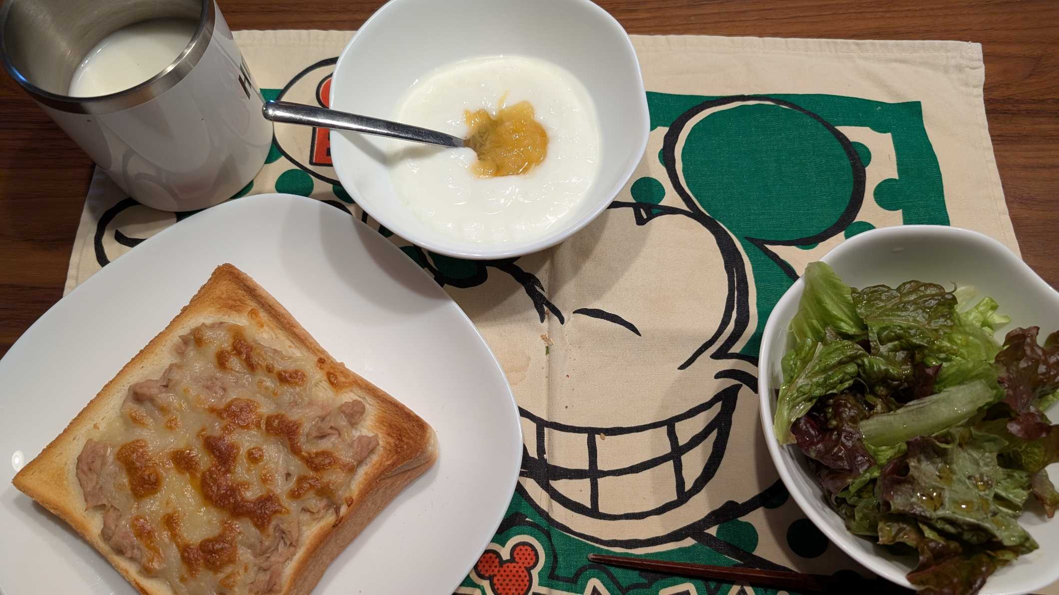 昼食→サラダ、マーマレードジャムヨーグルト、ツナチーズトースト、牛乳