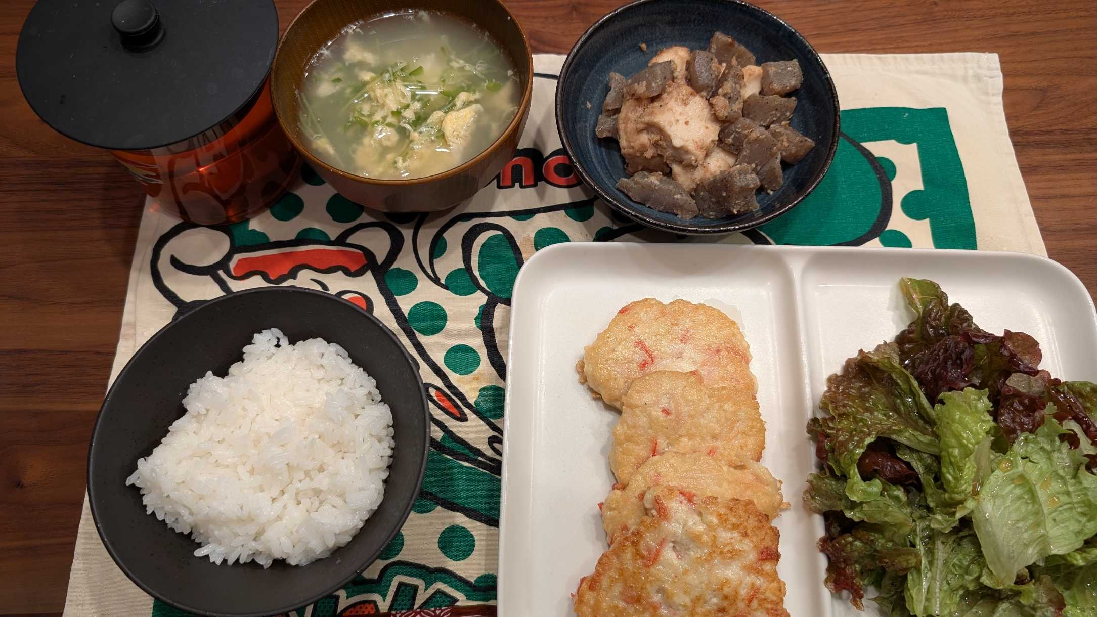 夕食→サラダ、豆腐のふわふわもち焼き、厚揚げとこんにゃくの胡麻おかか和え、ご飯、豆苗と玉子の味噌汁、ルイボスティー