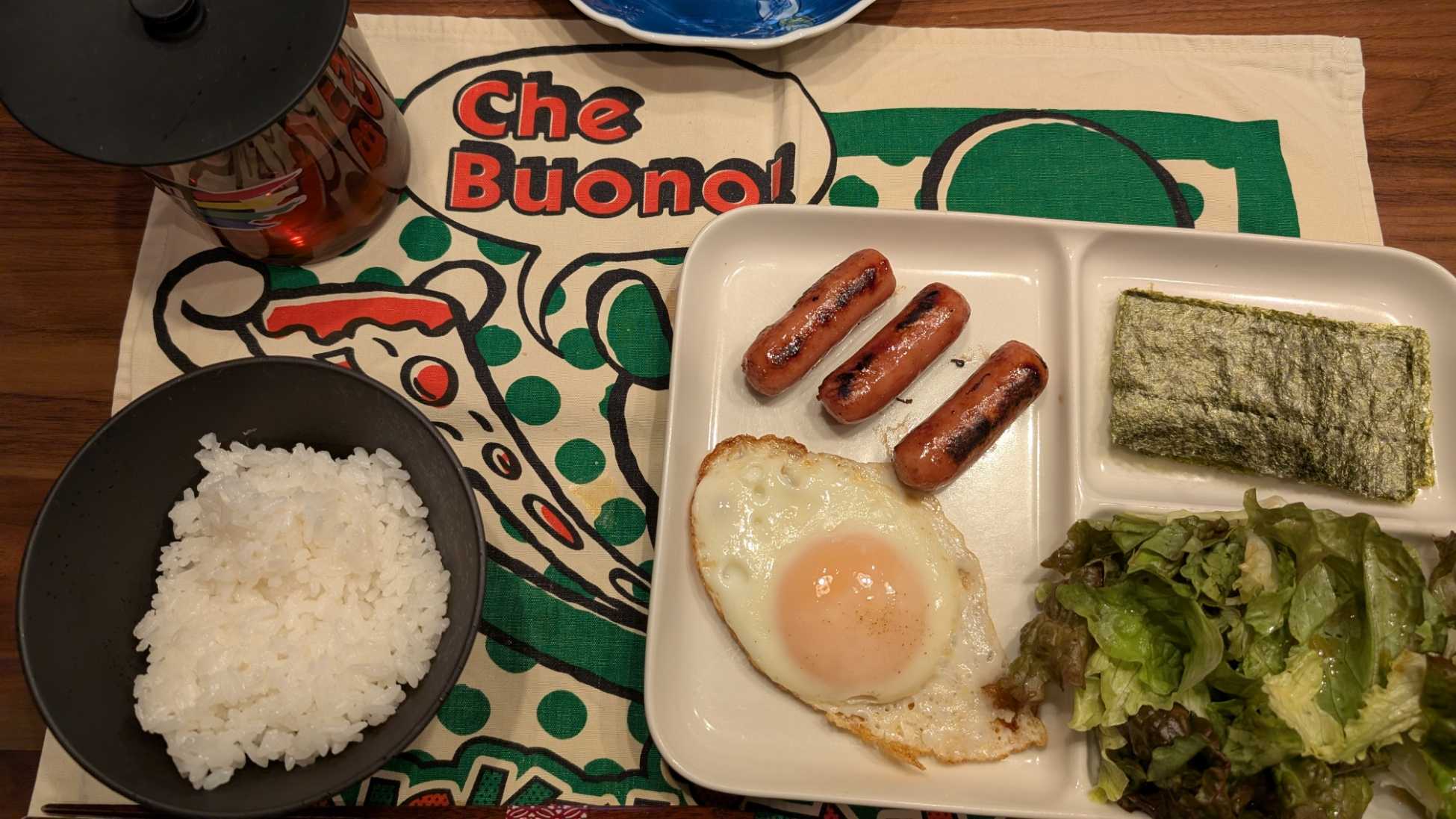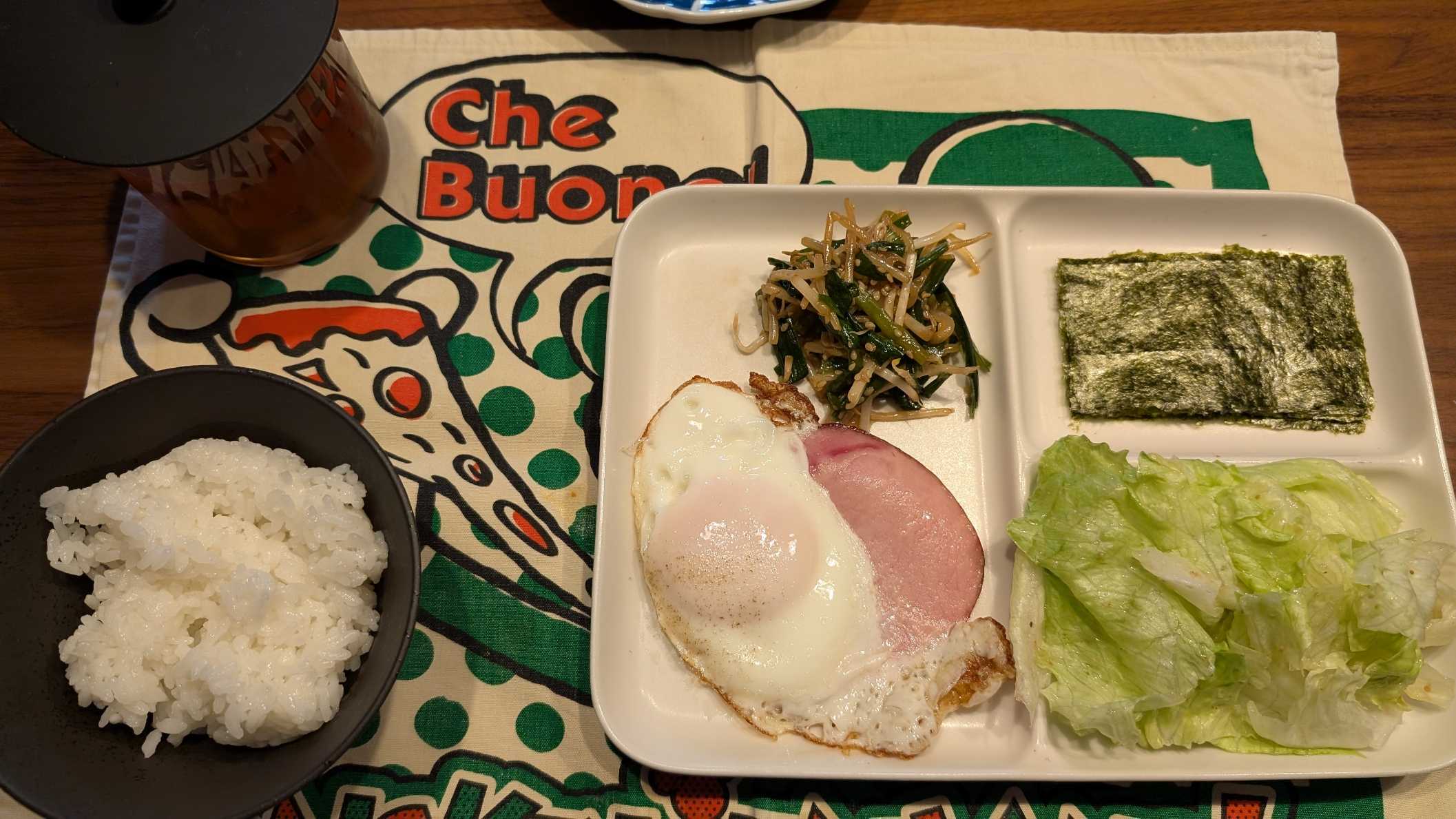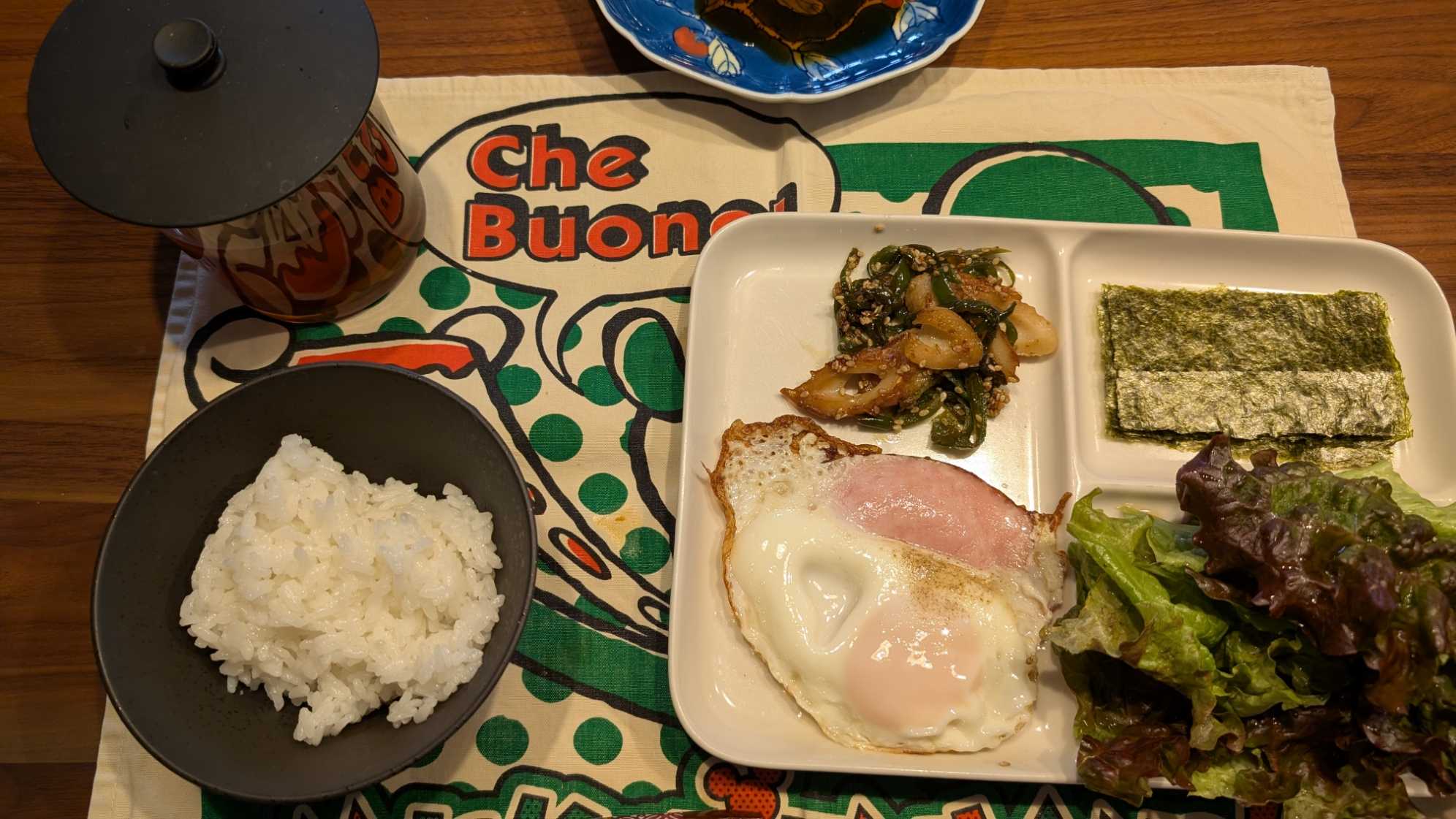 朝食→サラダ、ウィンナー3本、目玉焼き、焼きのり、ご飯、ルイボスティー朝食後→コーヒー昼食→サラダ、マーマレードジャムヨーグルト、明星・Netflix ブラック豚骨まぜそば、ルイボスティー夕食→サラダ、ささみの青のりまぶし、にらともやしのピリ辛ナムル、ご飯、ほうれん草の味噌汁、ルイボスティー