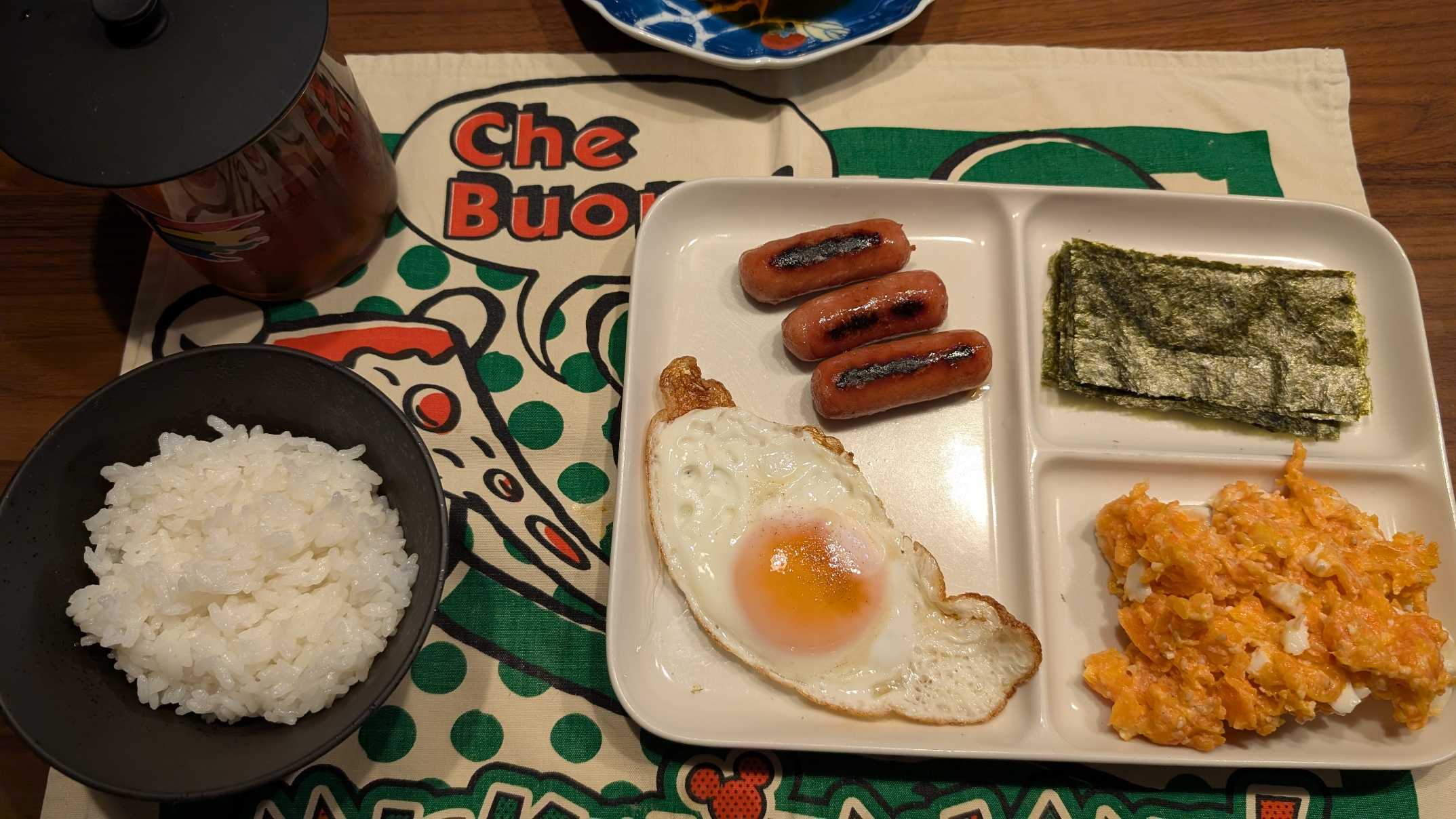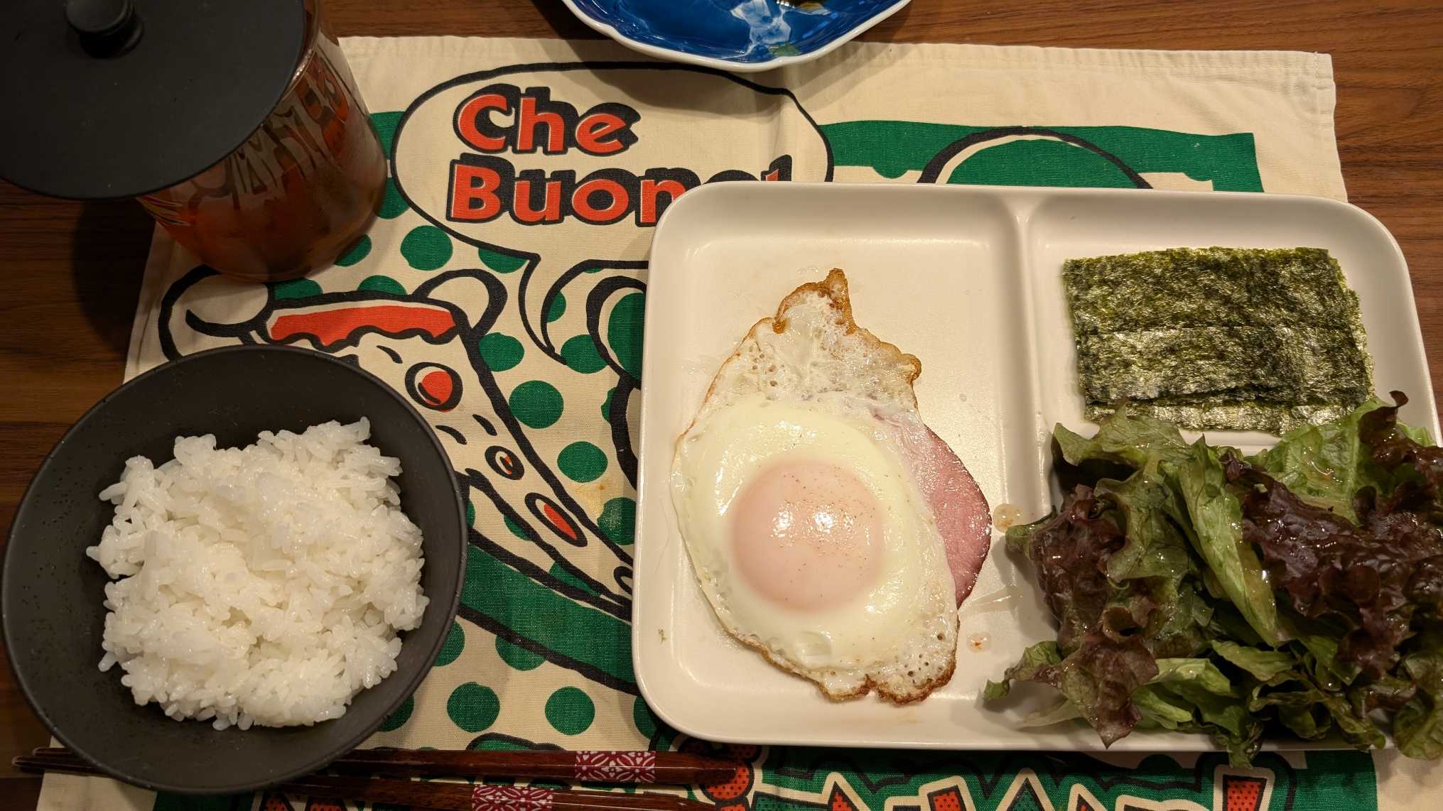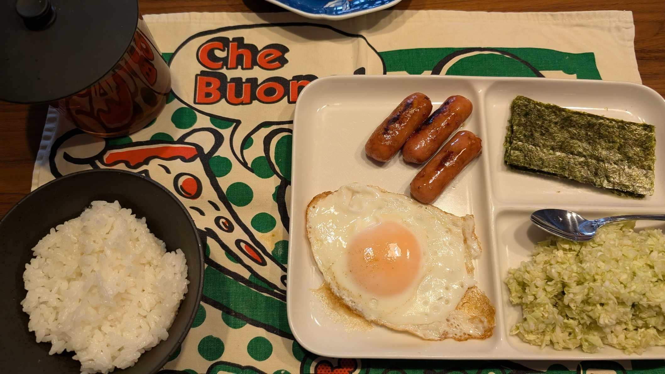 朝食→サラダ、ウィンナー3本、目玉焼き、焼きのり、ご飯、ルイボスティー朝食後→コーヒー昼食→サラダ、マーマレードジャムヨーグルト、明星・Netflix ブラック豚骨まぜそば、ルイボスティー夕食→サラダ、ささみの青のりまぶし、にらともやしのピリ辛ナムル、ご飯、ほうれん草の味噌汁、ルイボスティー