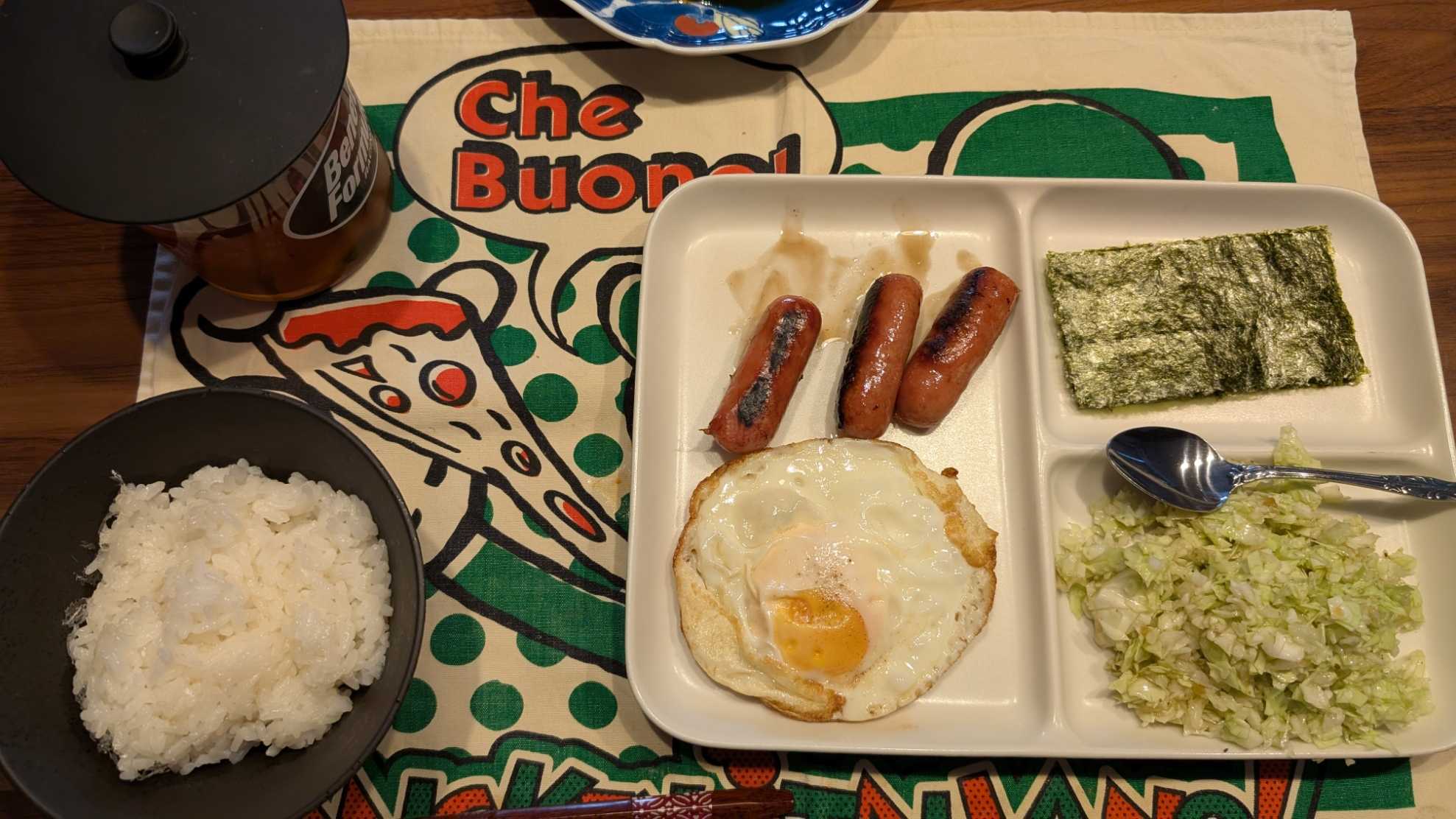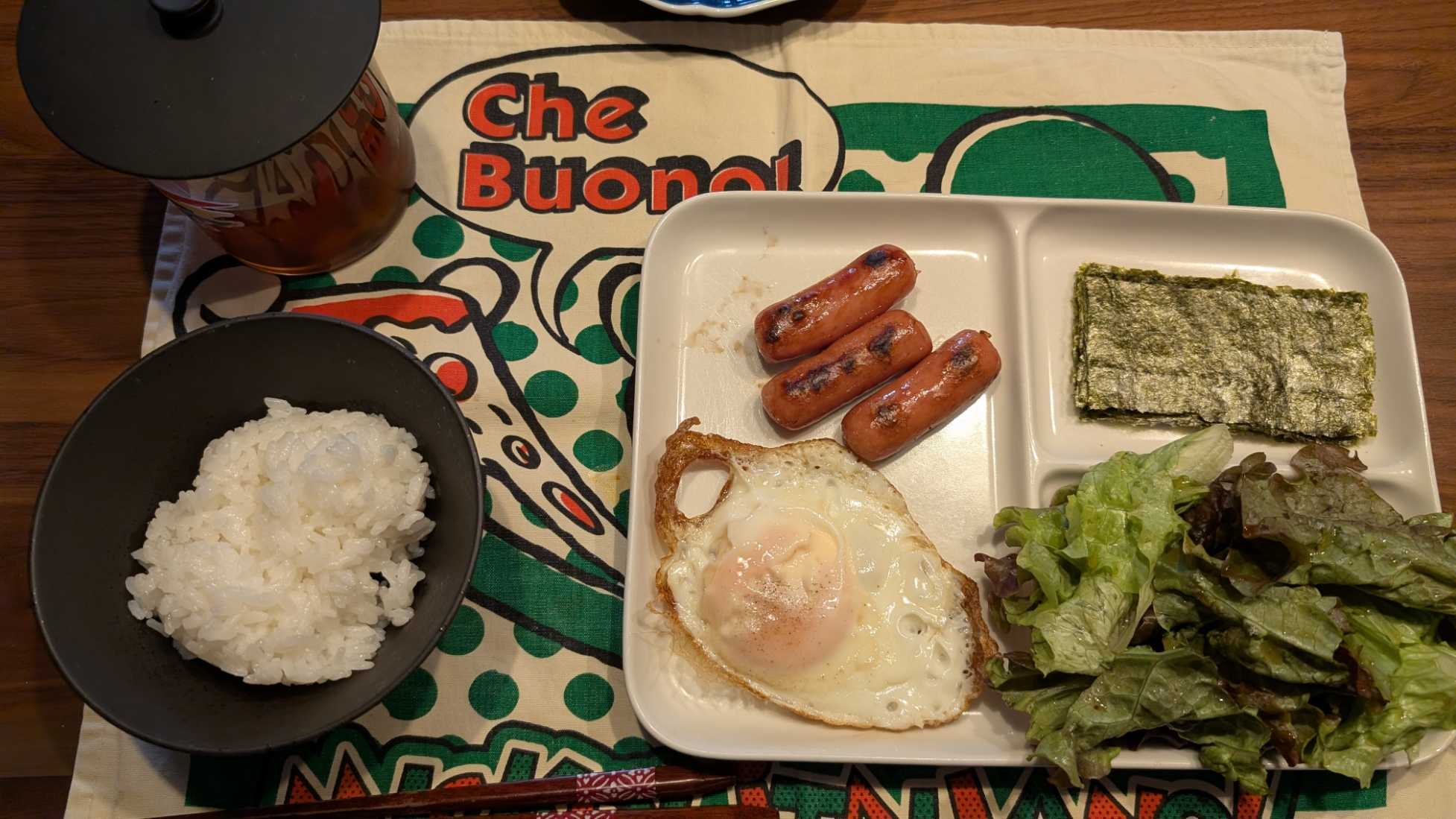 朝食→サラダ、ウィンナー3本、目玉焼き、焼きのり、ご飯、ルイボスティー朝食後→コーヒー昼食→サラダ、菓子パン2種、明星・辛口ブラックチゲラーメン、ルイボスティー夕食→サラダ、竹輪とピーマンの胡麻甘辛炒め、焼き餃子、ご飯、豆腐の味噌汁、ルイボスティー