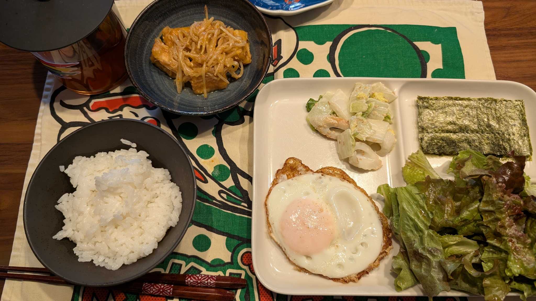 朝食→サラダ、ウィンナー3本、目玉焼き、焼きのり、ご飯、ルイボスティー朝食後→コーヒー昼食→サラダ、白桃ジャムヨーグルト、スクランブルエッグトースト、牛乳夕食→サラダ、白菜とちくわの胡麻マヨ和え、厚揚げともやしの甘辛味噌炒め、ご飯、小松菜の味噌汁、ルイボスティー