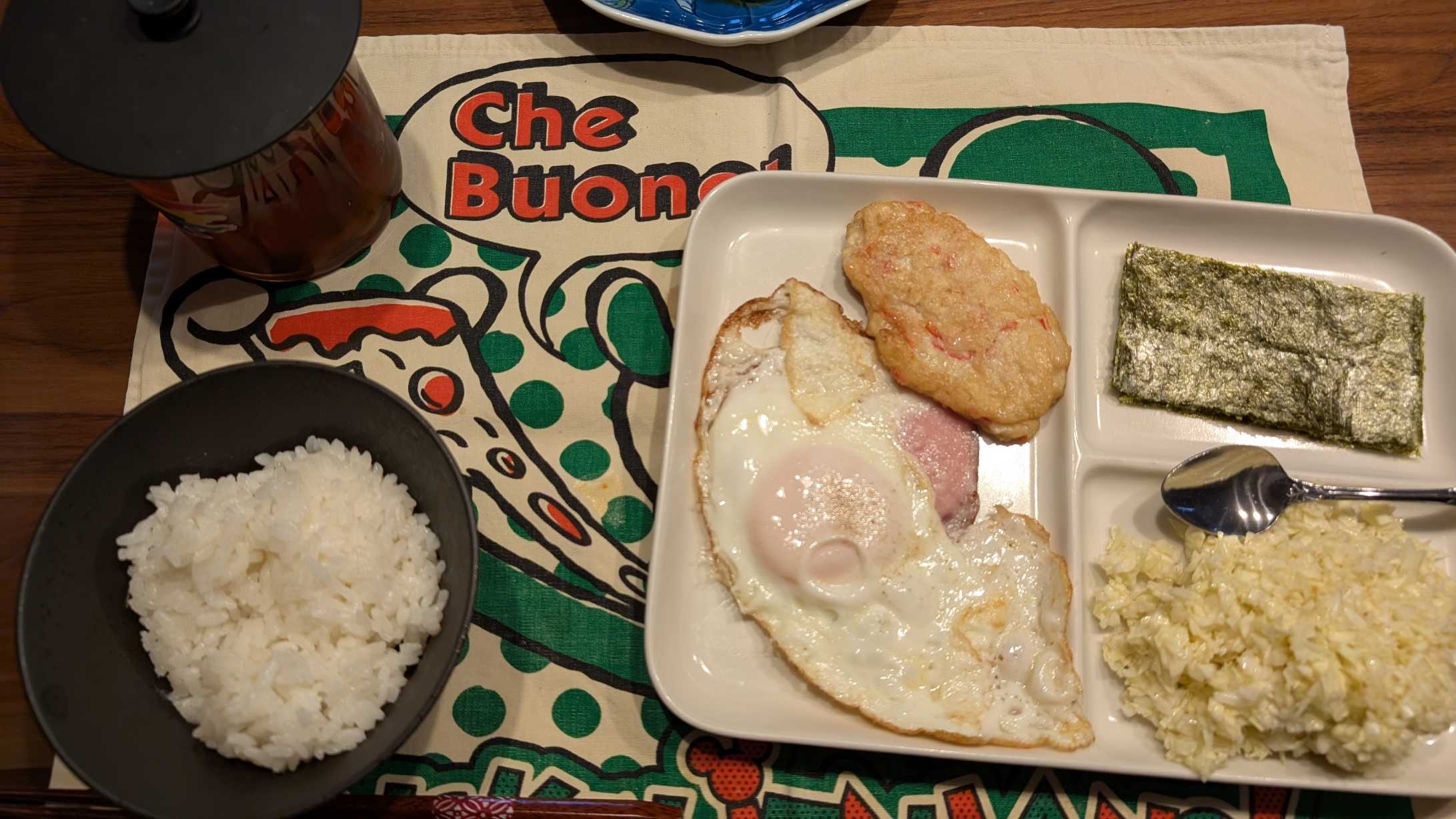 朝食→サラダ、ウィンナー3本、目玉焼き、焼きのり、ご飯、ルイボスティー朝食後→コーヒー昼食→サラダ、マーマレードジャムヨーグルト、ツナチーズトースト、牛乳夕食→サラダ、ツナマヨちくわのカニカマ和え、焼きメンチ、白菜の中華スープ、ご飯、ルイボスティー