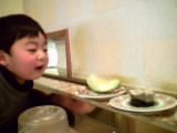 今日は家族で回転寿司に行きました。実は息子(4歳)は今日が回転寿司初体験。回る寿司を見て大感激と言いたい所ですが、一番興味があったのは回るメロン。席に着いたとたんに顔を近づけ「食べた~い」。今日何がおいしかった?の問いかけにも「メロン」。確かに今日は、シャリもネタも今ひとつだったような気がします。いつもはおいしいのにね。でも、子どもは大喜びでした。ちなみに、メロンは、一皿345円。結構お高いですね。