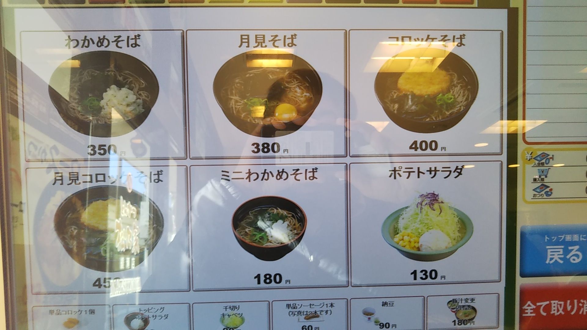 タッチパネル式の券売機のTOP画面(写真なし)の上のほうに「そば」表示があり、それに触れるとそばメニュー