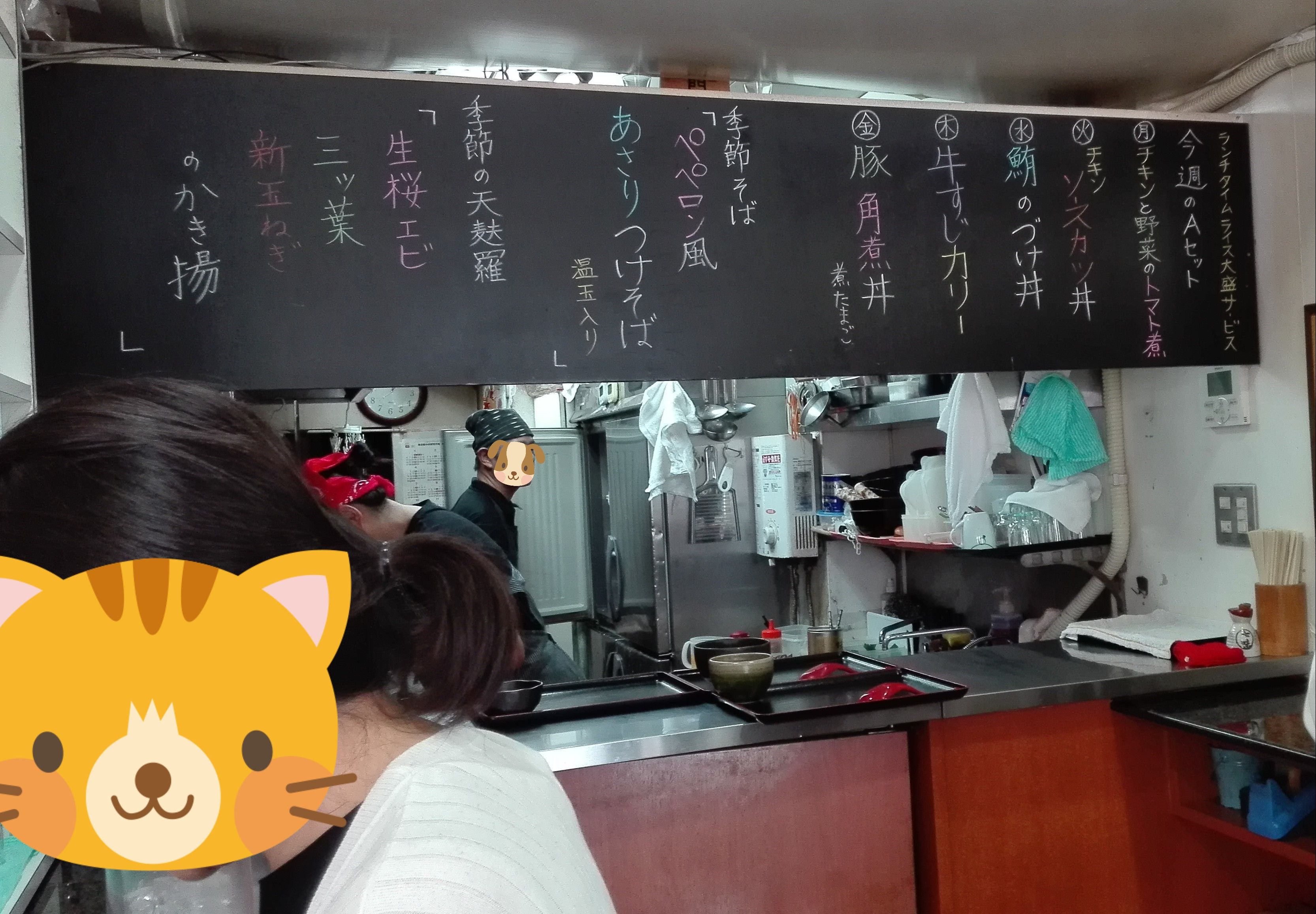 食券を渡して待つ。注文&受け渡し口の頭上にあるメニューの丼ものも気になるところ。