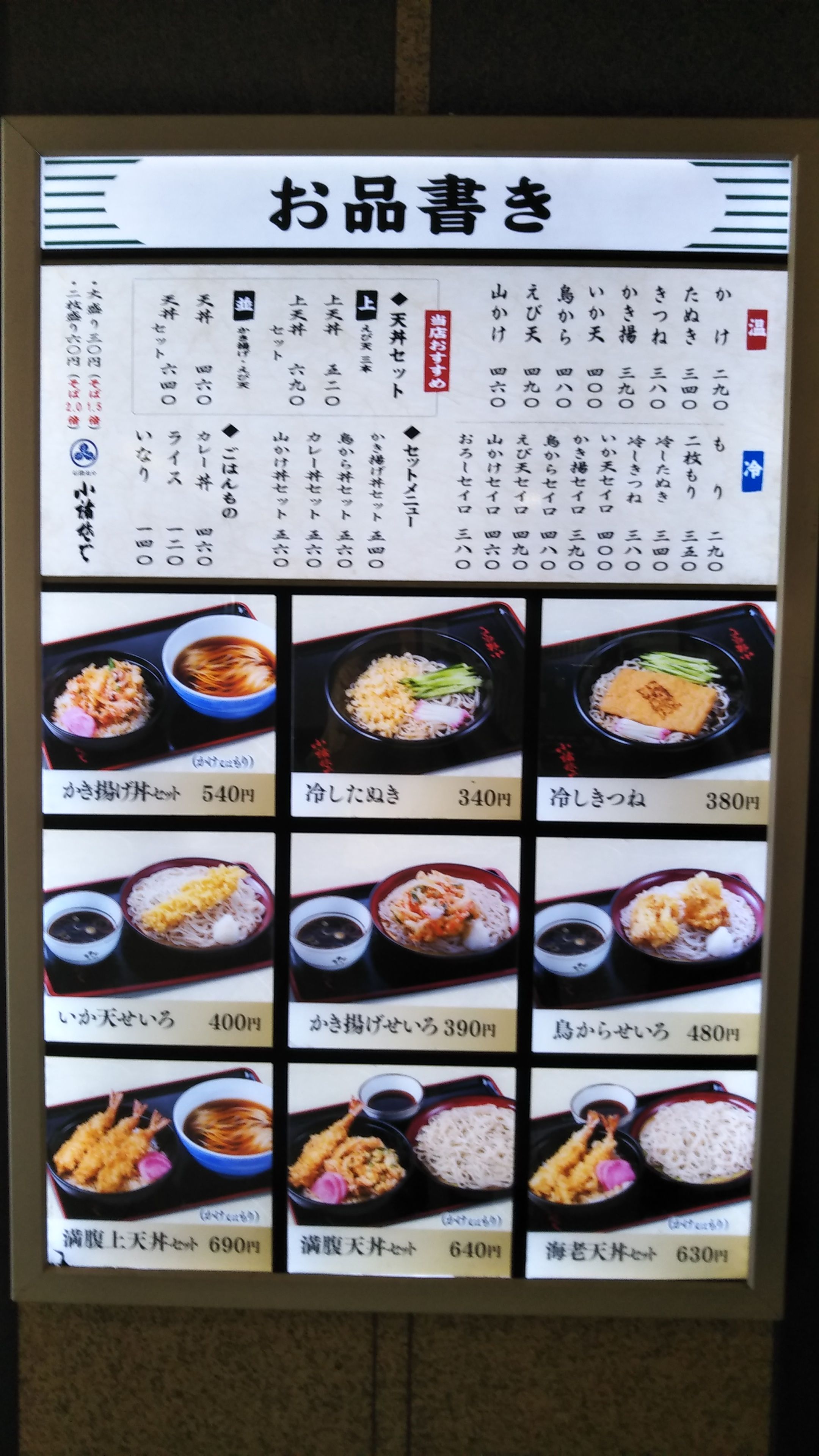 店頭のお品書き。チェーン店として期間限定品などのイベントがあっても、当店などの駅そば店は除外されることもたまにある。今回の『揚げ茄子おろし』は提供しているけど。