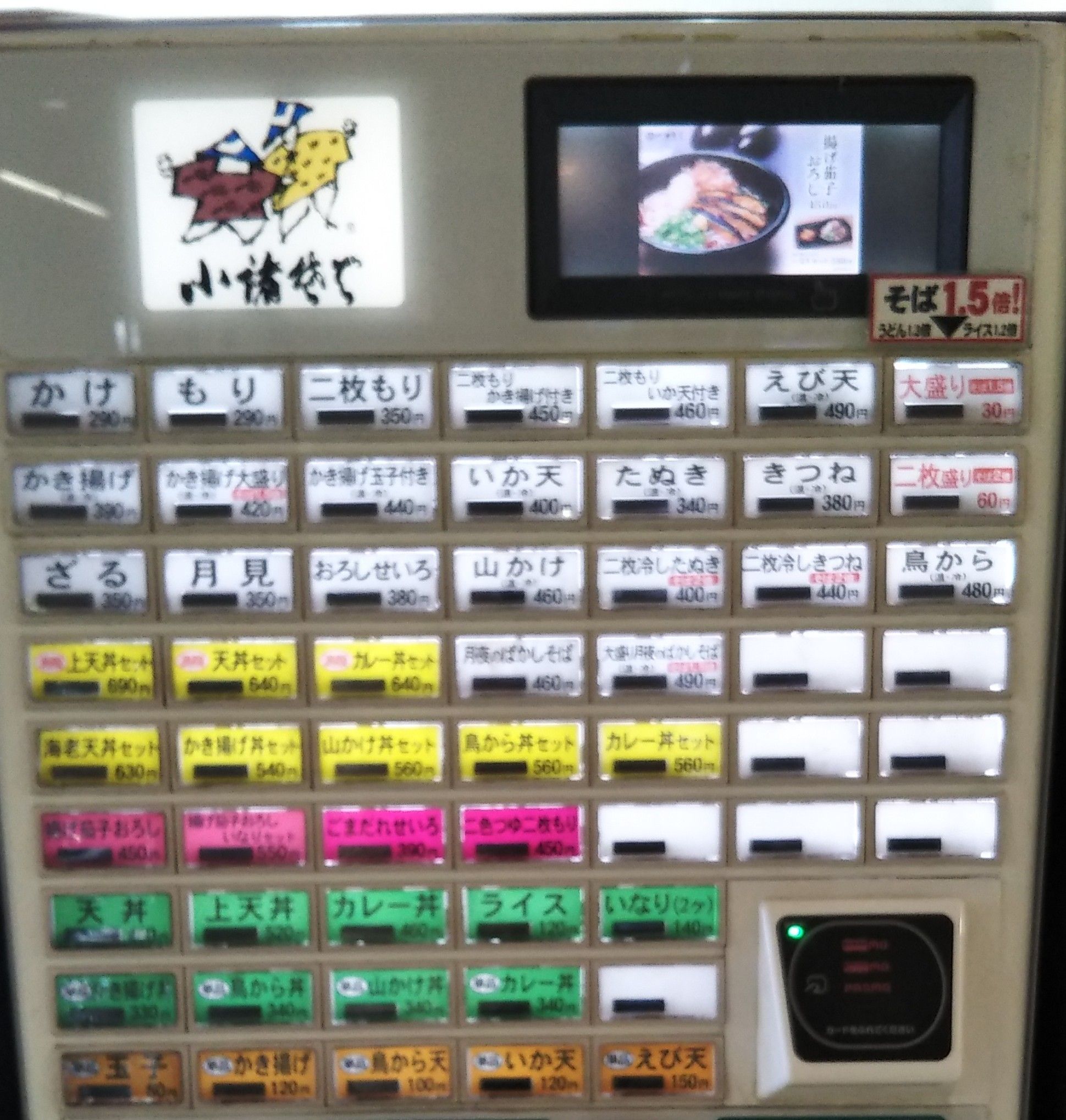 券売機。店頭のお品書きでは見当たらない『二枚冷やしたぬきそば』\400に魅かれた