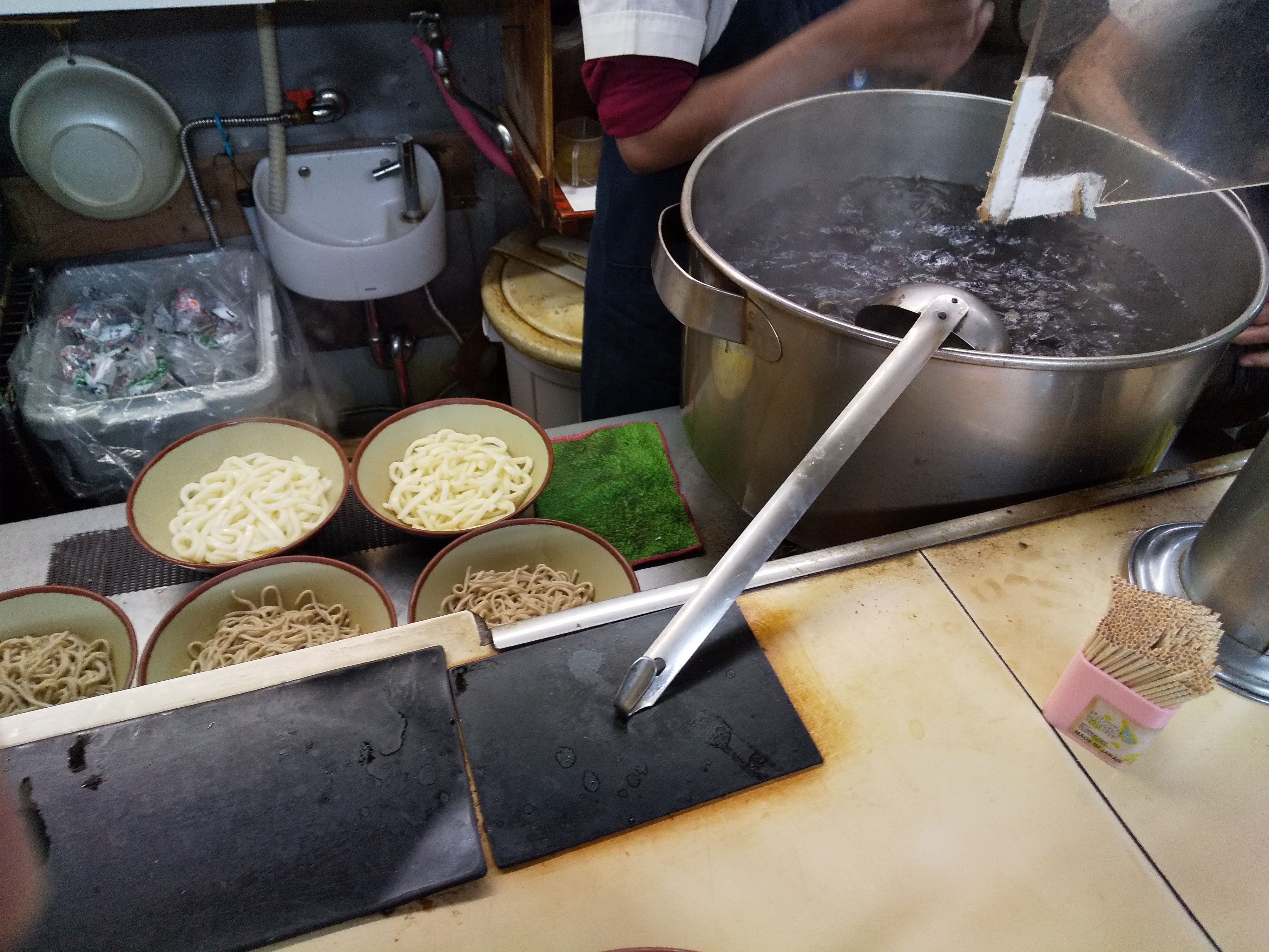 熱々のつゆ。途切れない注文にも茹で麺セットアップし、準備万端。