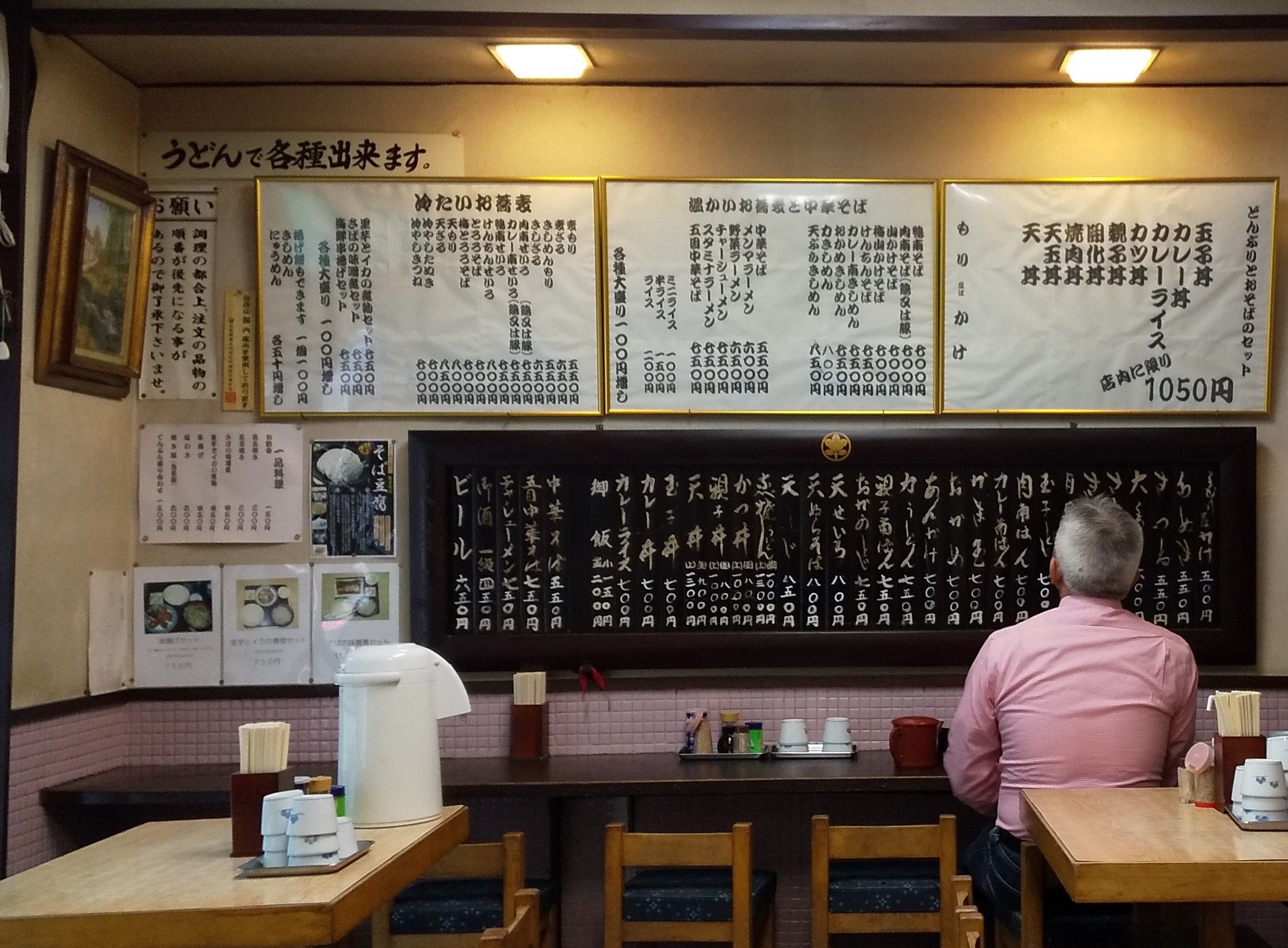入店。店内も昔ながらの大衆そば屋風情。お品書きは壁にある。