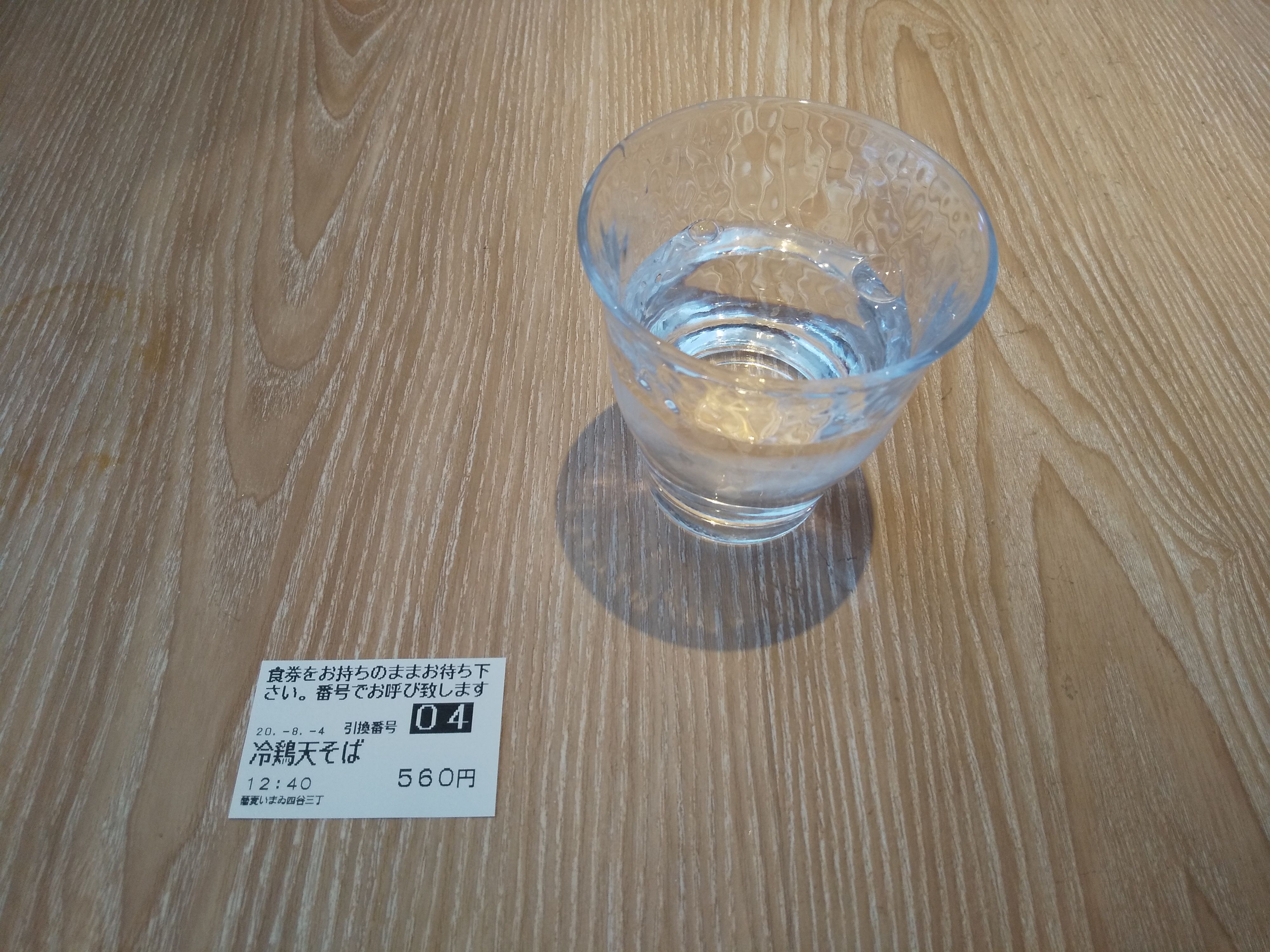 店内の奥が感染予防で衝立のあるテーブル席、入口近くが立ち食いエリア。私は入口近くで立ち食い。荷物置きあり。水セルフ。配膳・下膳セルフ。